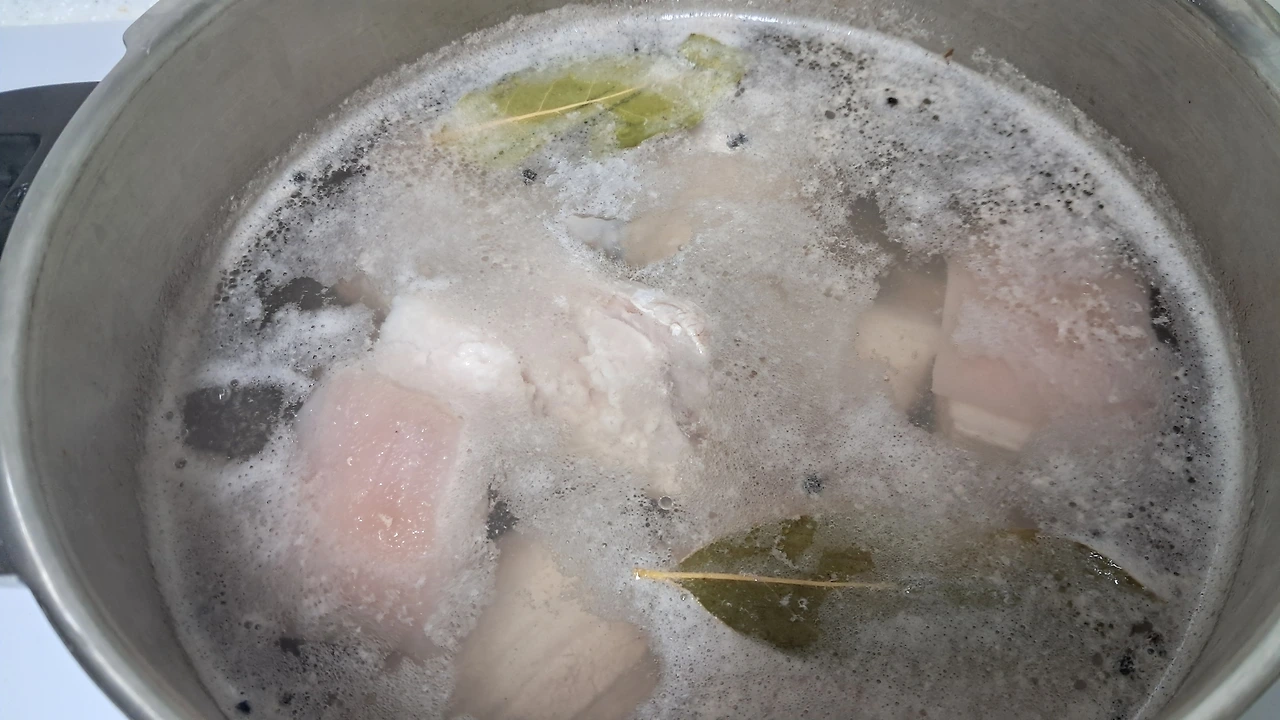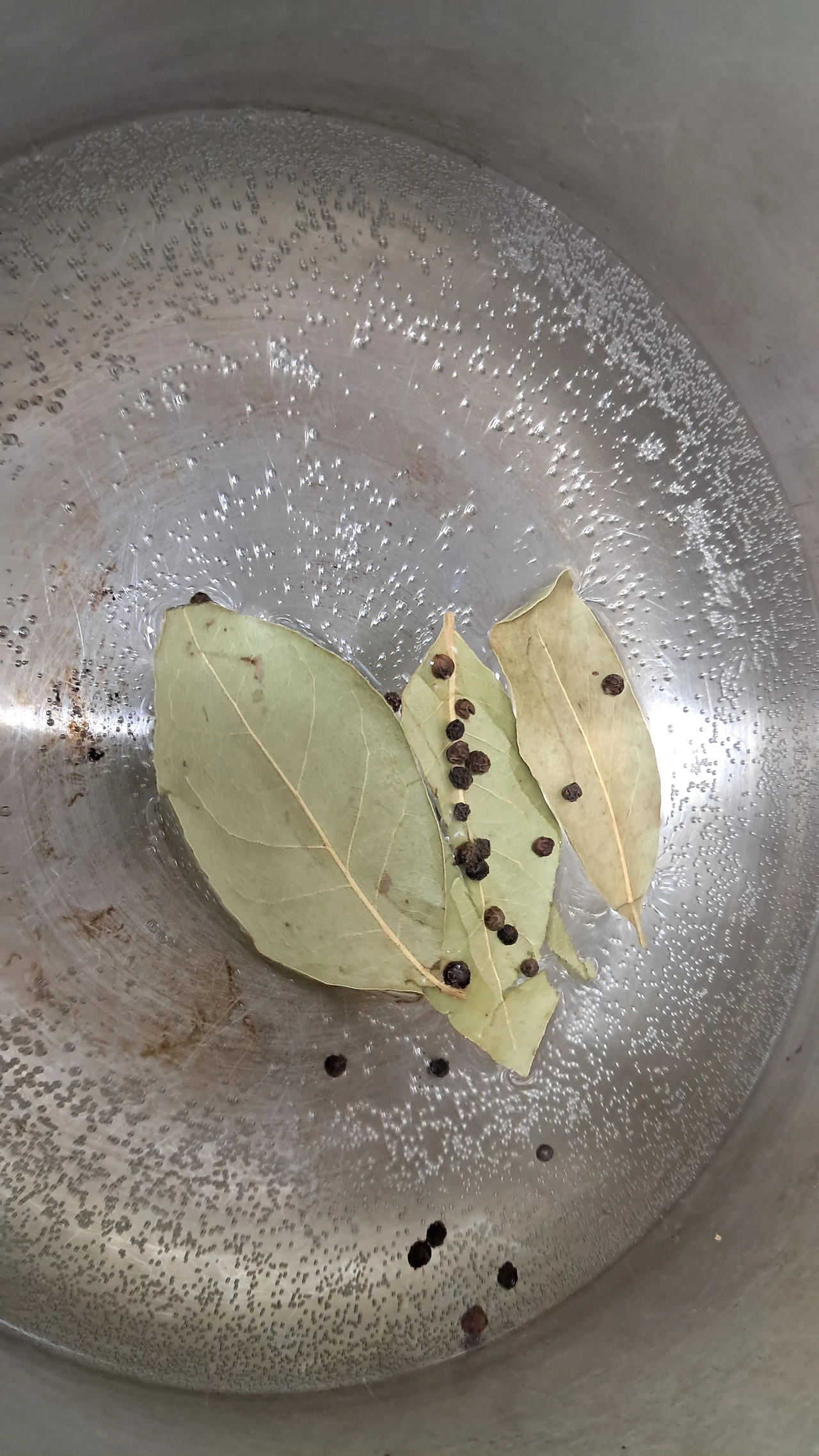팔팔 끓는 물에 월계수잎 3장과 후추알과 고기를 넣고 10분 데쳐준다. 거품 말고 고기만 건진다. 채반에 올려 그대로 식힌다.