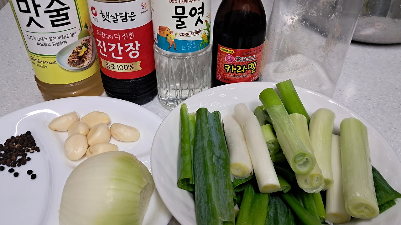 양조 진간장 종이컵 1컵, 맛술 4스푼, 물엿 3큰술, 설탕 2큰술, 캐러멜소스 1큰술, 물 종이컵 사이즈로 2.5컵