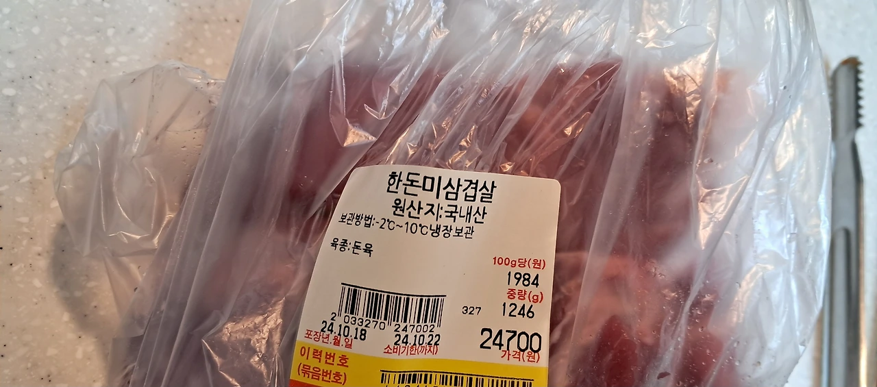 정육점아저씨께 "동파육이란 걸 처음 해보려는데 통삼겹 구입하면 될까요?" 했다. 세일 중이라고 어필하신다. 보여주시는 덩어리 그대로 샀다. 실은 한근이 얼마의 분량인지 모른다. 보이는 대로 달라고 했다. 집에 와서 보니 1,246g이다. 24,700원. 질릴 때까지 먹으라고 많이 샀다. 2근을 샀나 보다.