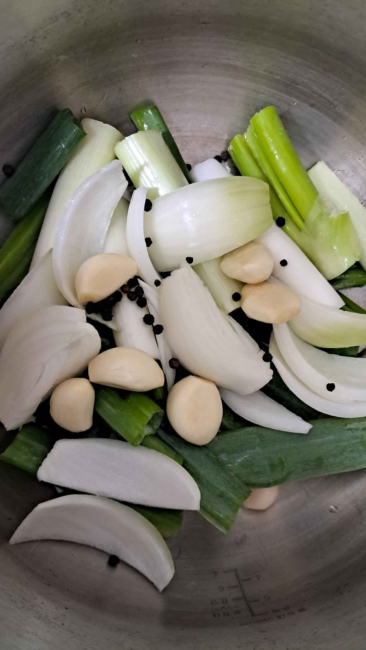 양파 1/2개, 대파 2대, 통마늘 7개, 통후추 30알