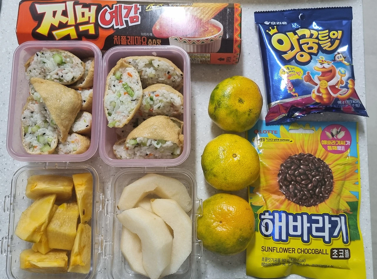 어제 퇴근하면서 중1 딸과 남편이 장을 봐왔다. 딸이 통일전망대에 체험학습을 가는데 과자와 도시락 재료를 구입해온 것이다.