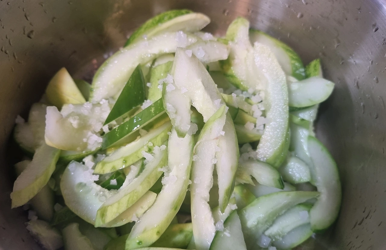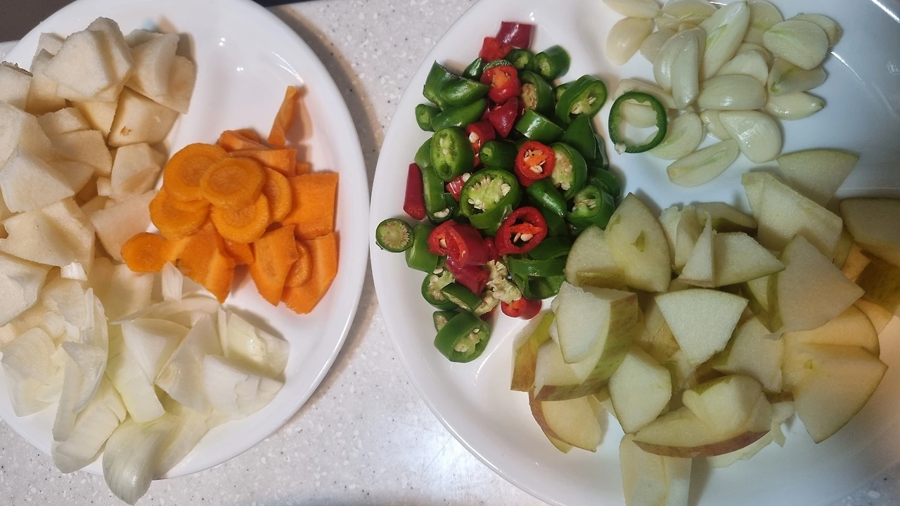 사과 1, 배 1, 양파 1. 당근 조금, 청고추 2, 홍고추 2, 쪽파 한 줌, 편마늘 조금. 오이의 속을 파고 어슷 썰어 소금에 절여놓는다. 거의 텃밭에서 수확한 재료이기에 사과 배만 구입하면 된다.