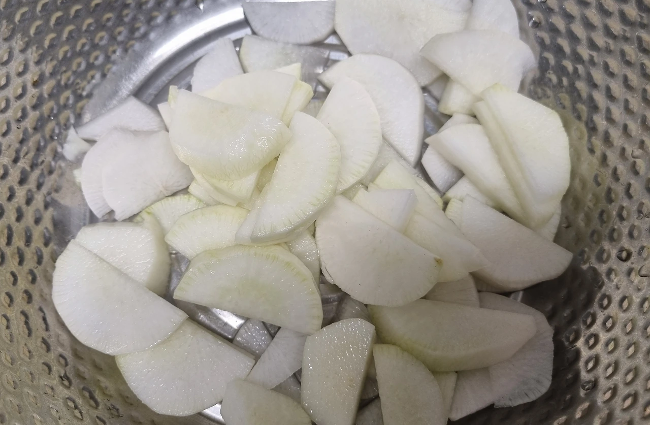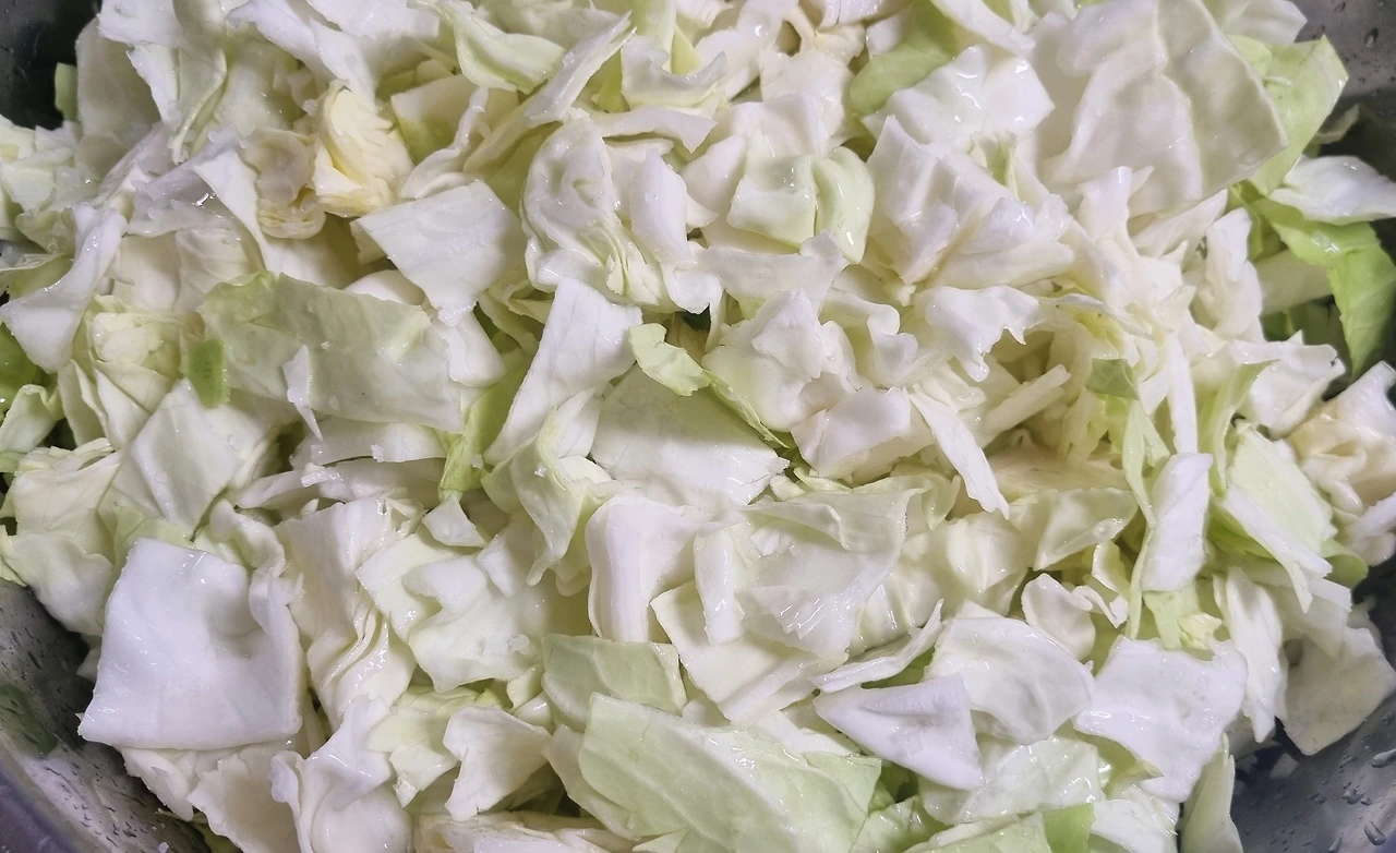 양배추를 먹기 좋은 크기로 잘라 여러 번 헹군다. 굵은소금을 흩뿌려 절여놓는다. 무도 나박 썰기 하여 함께 절인다.
