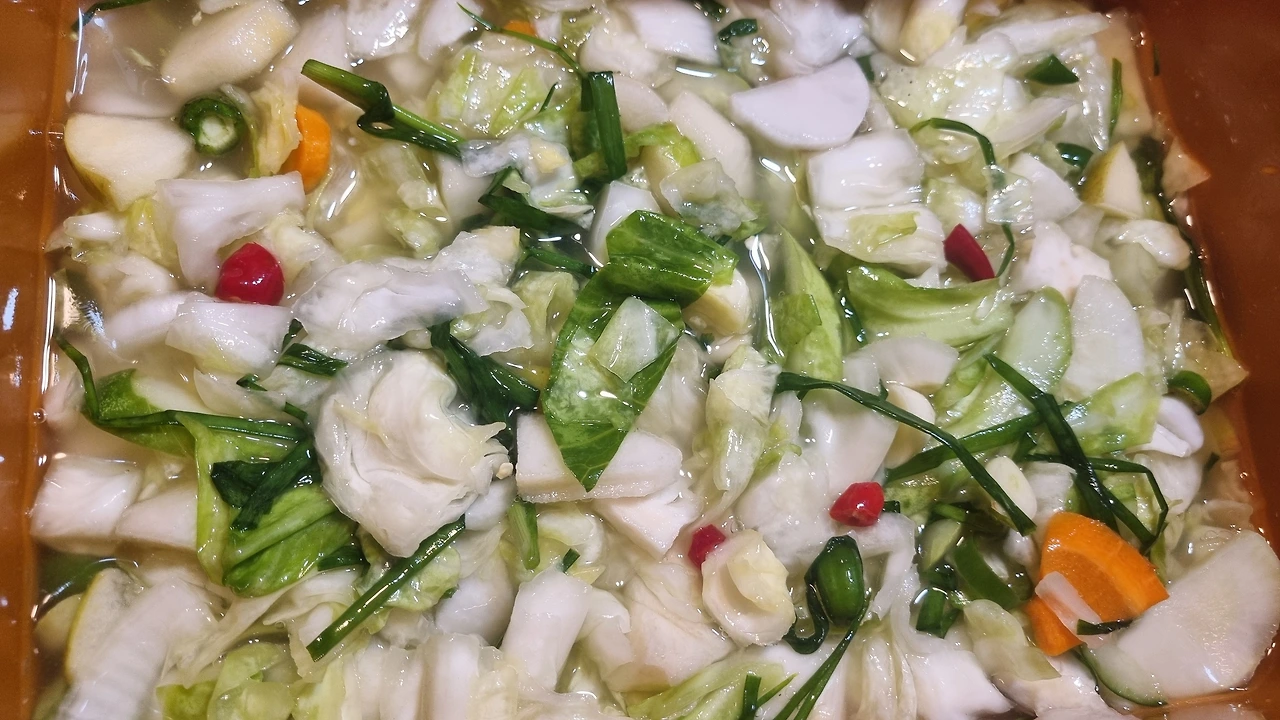 찹쌀풀을 쑨다. 정수기 찬물을 많이 추가한다. 마늘청, 생강청, 고추청 각 한습순, 매실액 종이컵 한 컵을 넣는다. 멸치액젓 5스푼을 넣는다. 소금 두 스푼, 뉴슈가 한 스푼을 넣어 잘 젓는다.