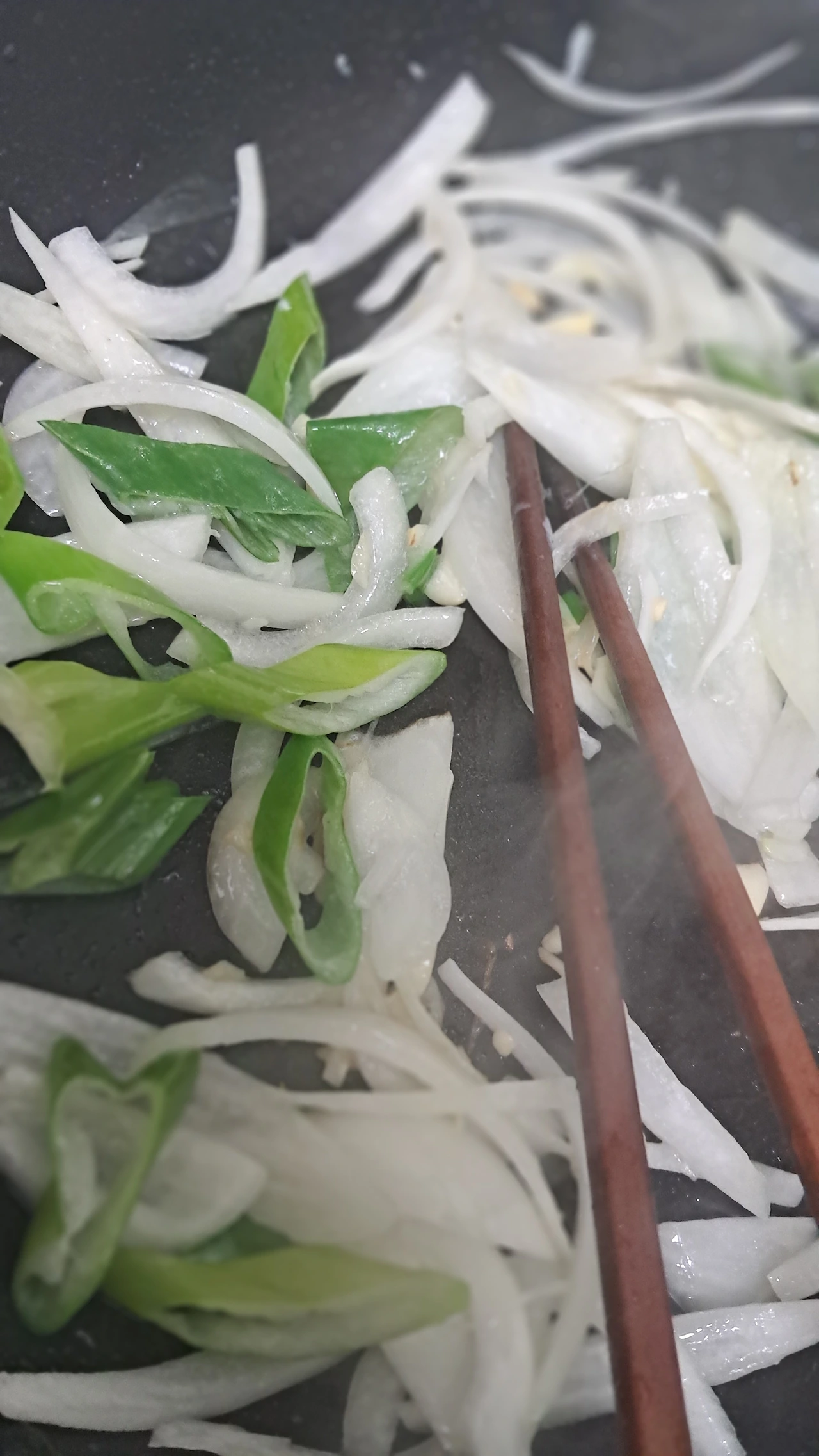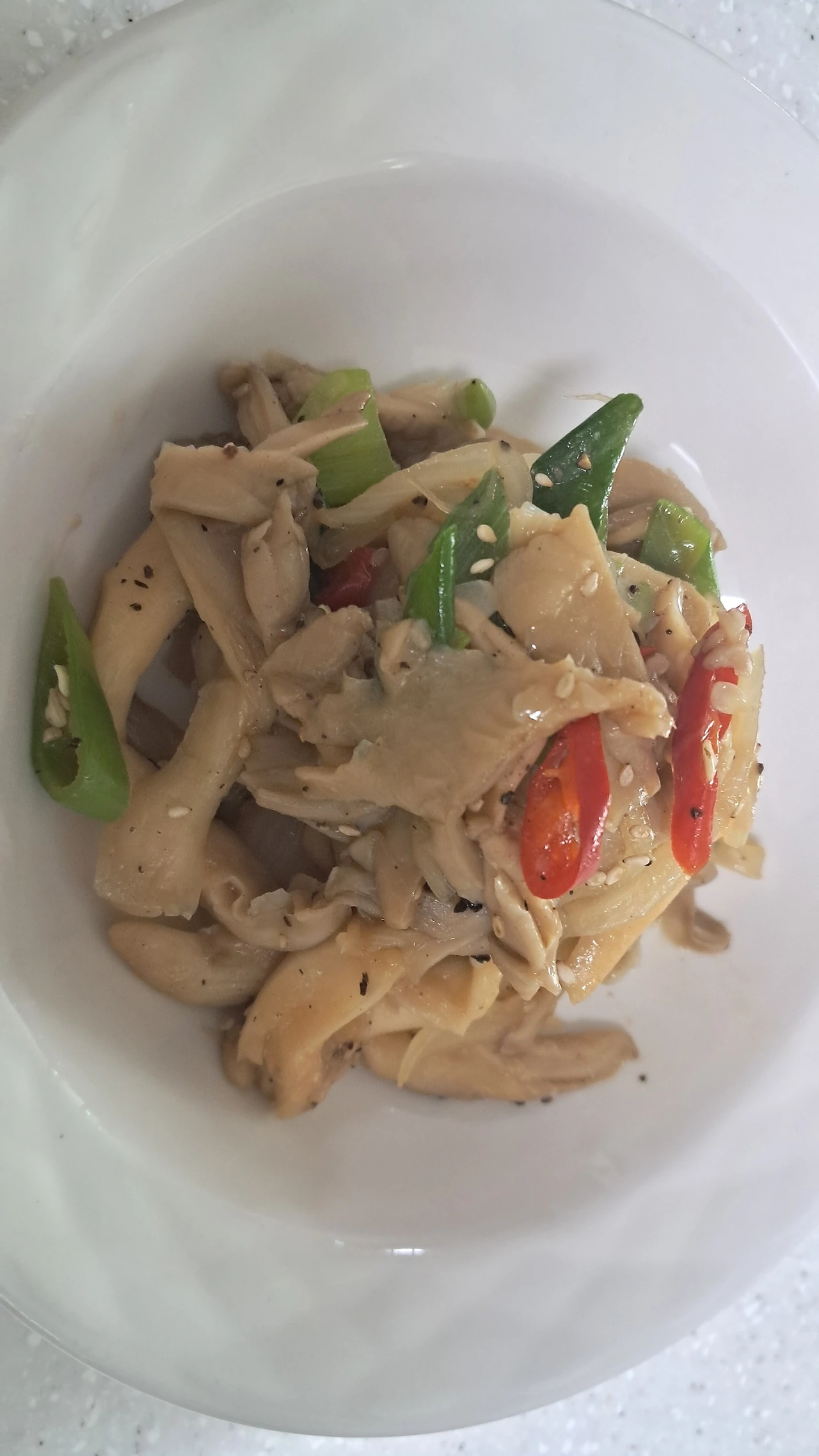 4. 마늘, 대파, 양파를 기름에 볶는다. 충분히 볶아진 버섯에 통후추를 갈아 넣는다. 고추를 넣고 참기름과 참깨를 넣어 볶는다. 마지막 맛을 보고 소금 간을 추가하거나 멸치액젓 반스푼을 넣는다.