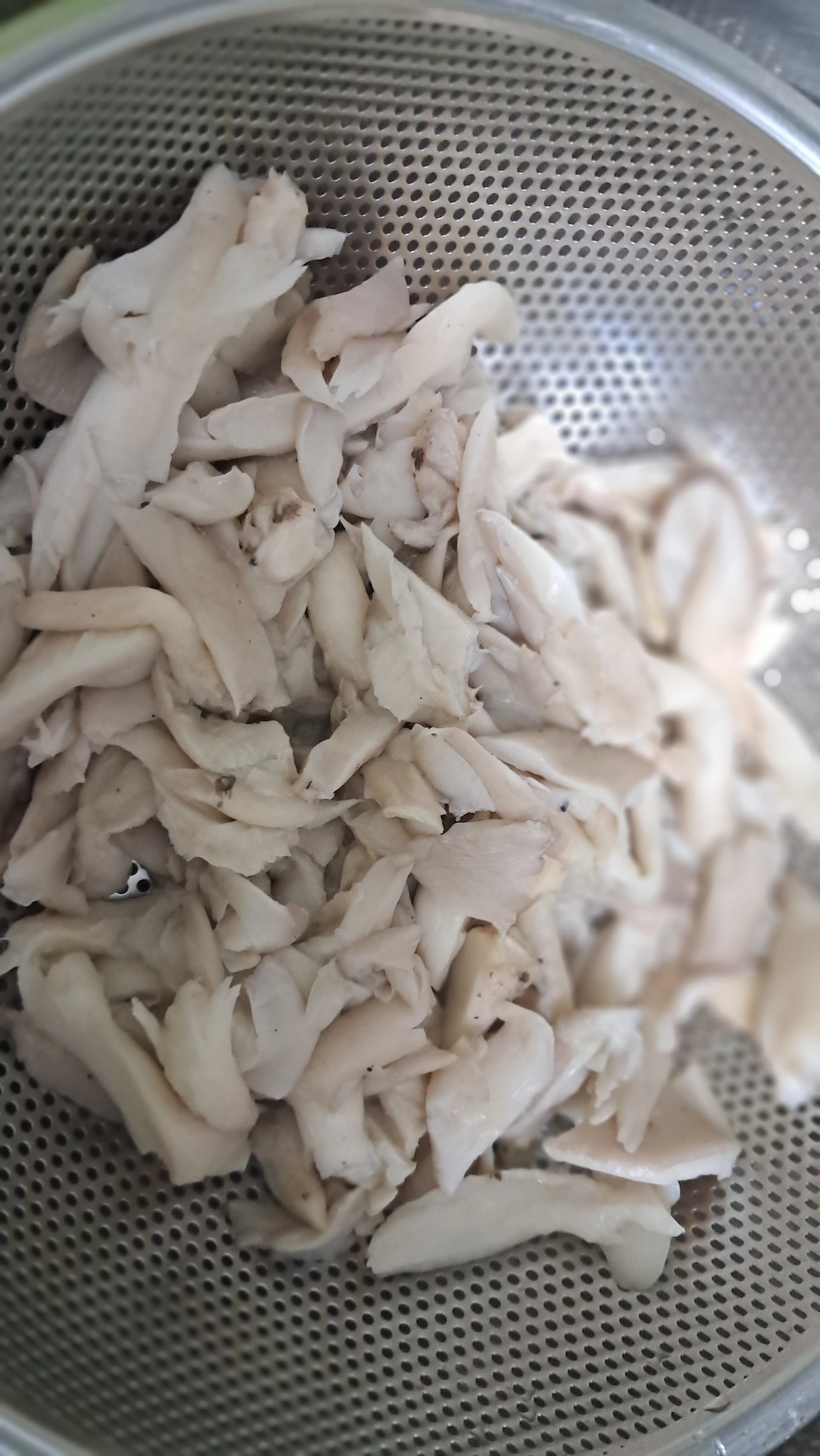 2. 프라이팬에 기름 없이 버섯을 넣고 수분을 날리듯 볶는다. 소금을 한 꼬집 뿌린다. 수분이 더 많이 나온다. 물이 나오면 계속 덖다가 버섯을 채반에 밭쳐 수분을 뺀다. 쫄깃한 식감을 위해서다.
