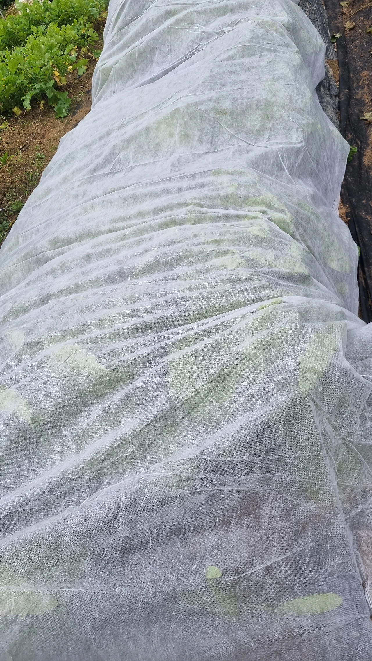 일요일인 내일 서리가 내릴 예정이라고 한다. 배추는 얼고 녹고를 반복해도 상관없지만, 무는 한번 서리를 맞으면 다 키운 작물을 버리게 되는 셈이다. 습기를 별로 좋아하지 않는 작물이라 바람이 통하는 흰색 부직포를 덮어주었다.