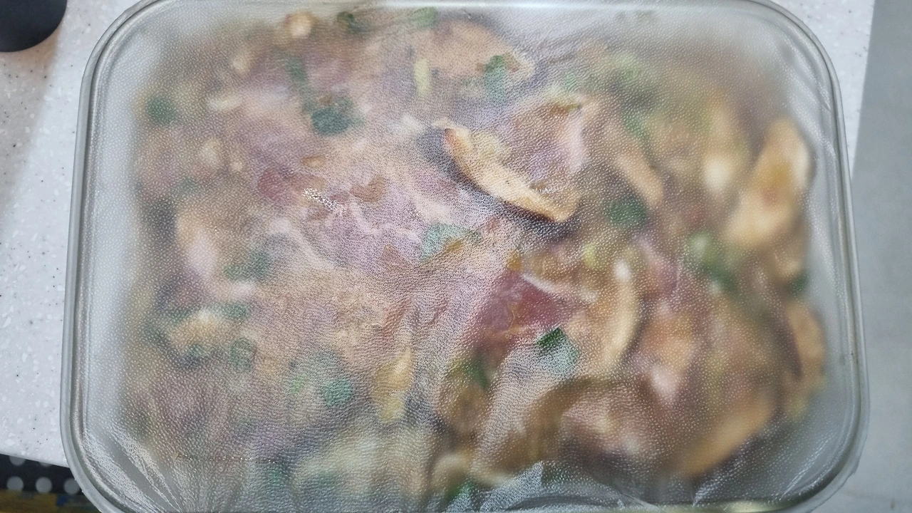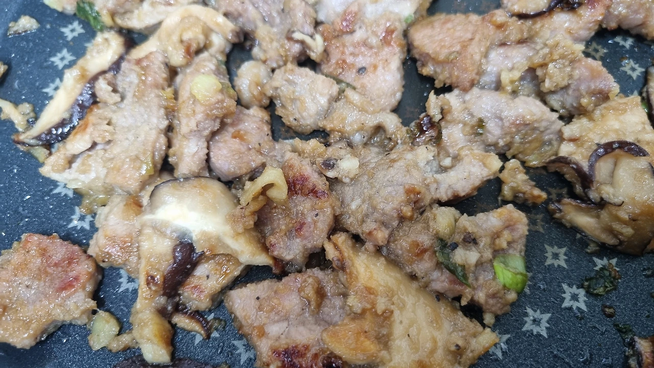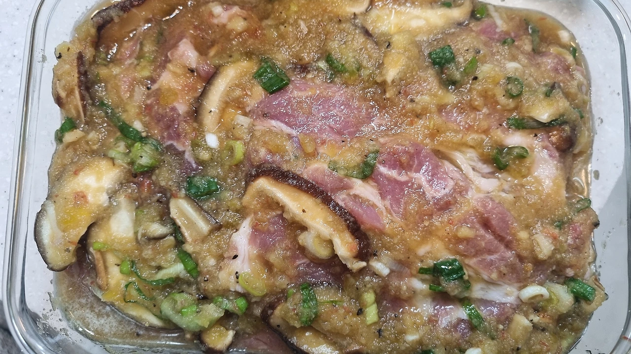 1과 2를 섞고 고기를 넣는다. 유리 밀폐용기에 고기-표고-고기-표고를 켜켜이 쌓았다. 랩을 씌웠다. 냉장고에서 1~2일 숙성한 후 프라이팬에 구워 먹으면 된단다.