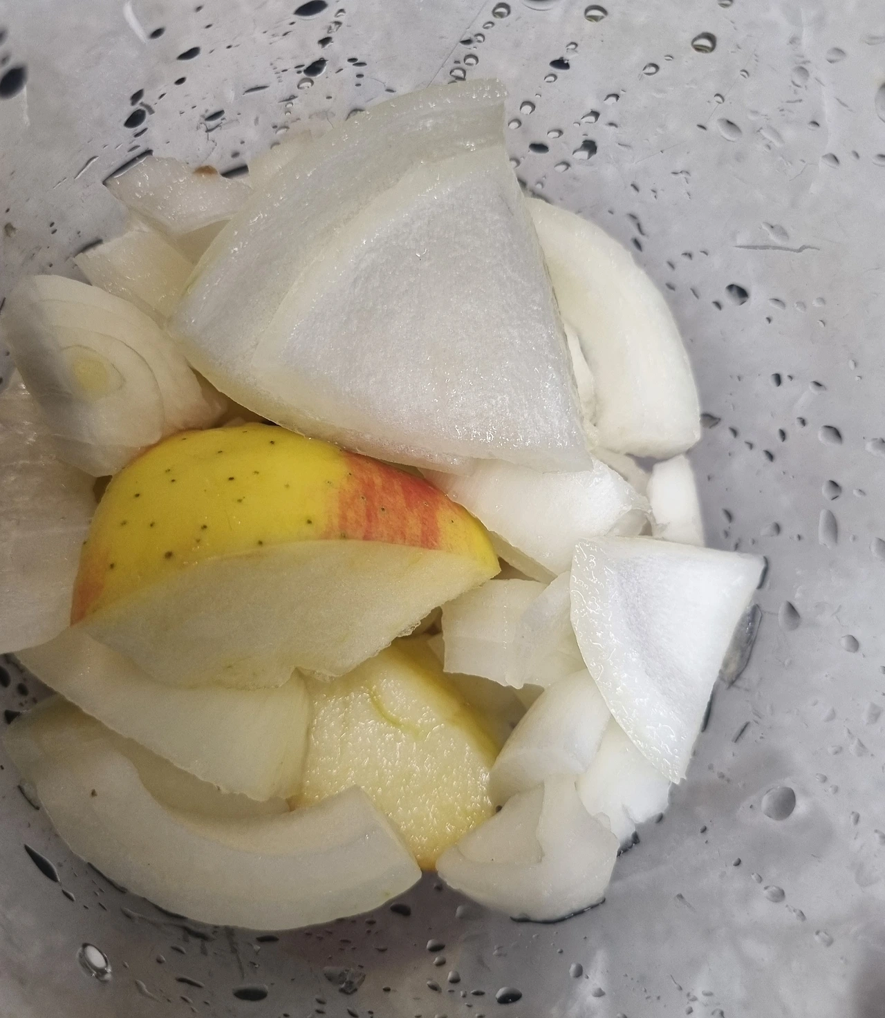 물 1컵, 사과 1개, 양파 1개를 믹서기에 곱게 간다.(사과와 양파는 고기를 부드럽게 하고 단맛을 더해준다)