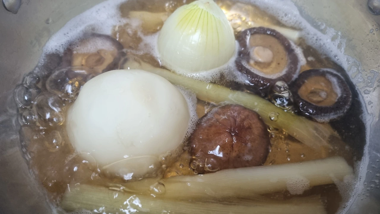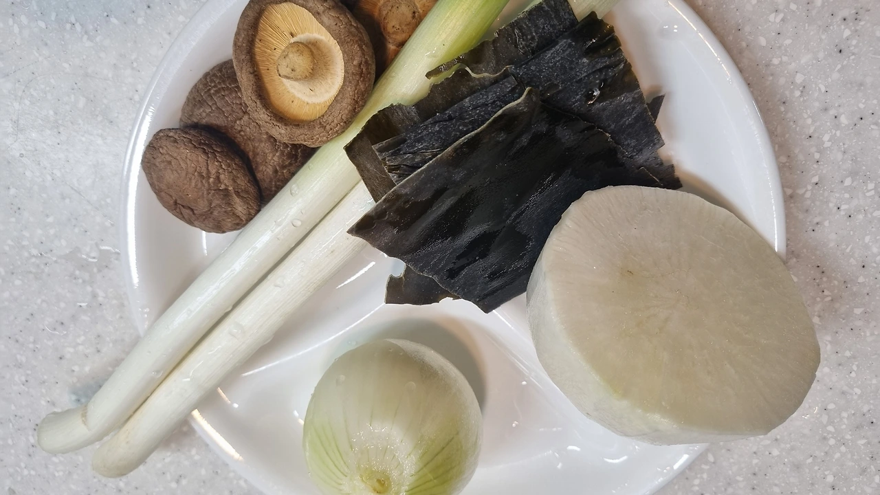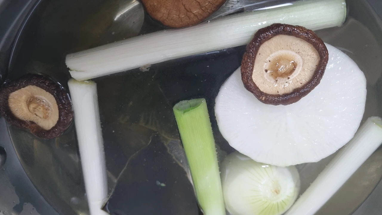 2) 양파 1개, 무 1/3개, 말린 표고 한 줌, 다시마 적당량