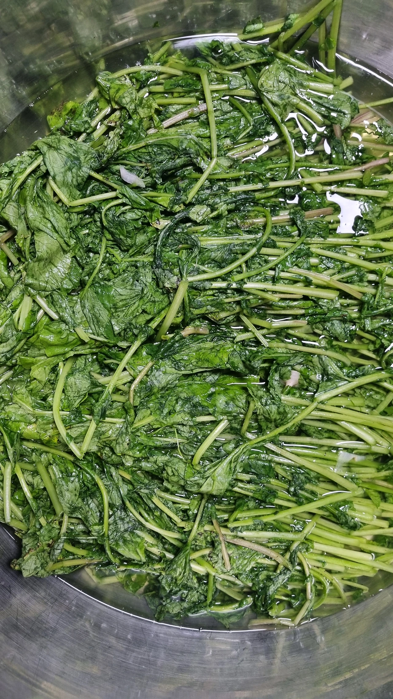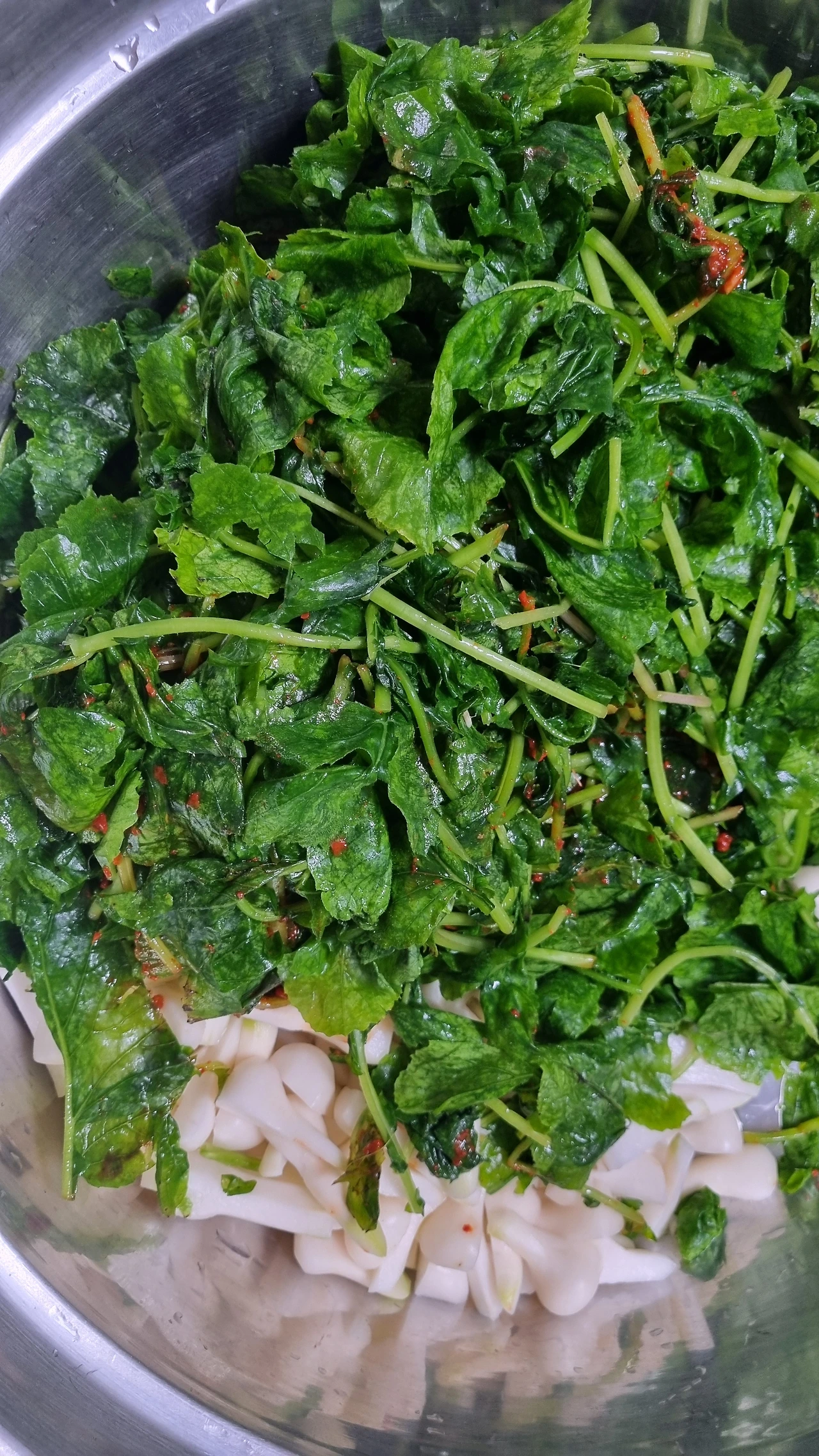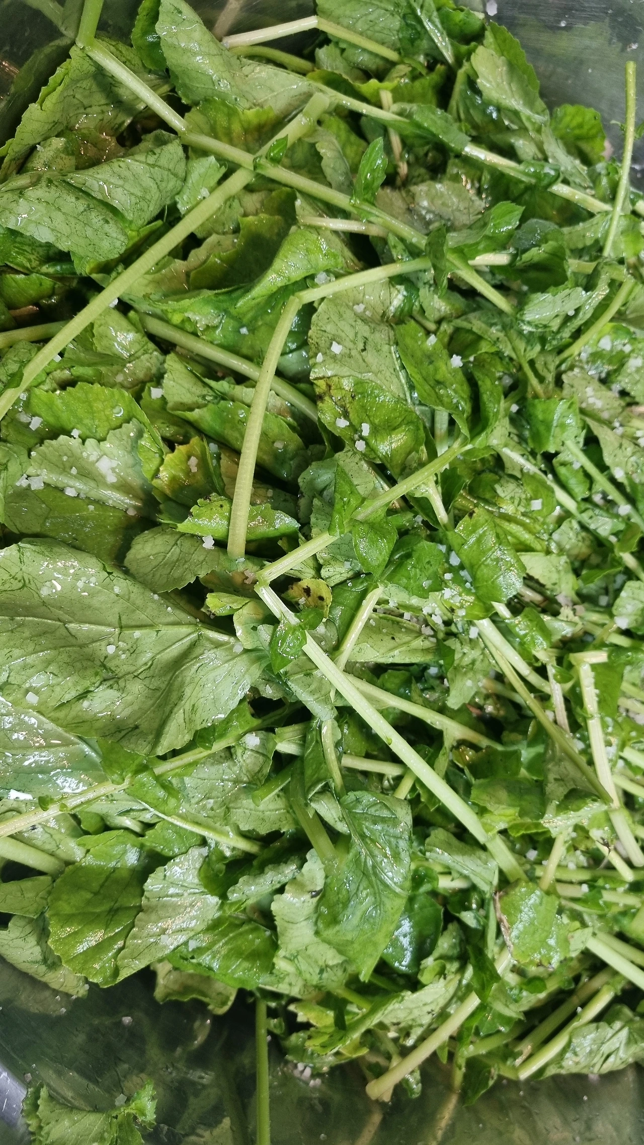 2) 다른 대야에 무청을 넣고 소금 한 컵을 흩뿌린다.