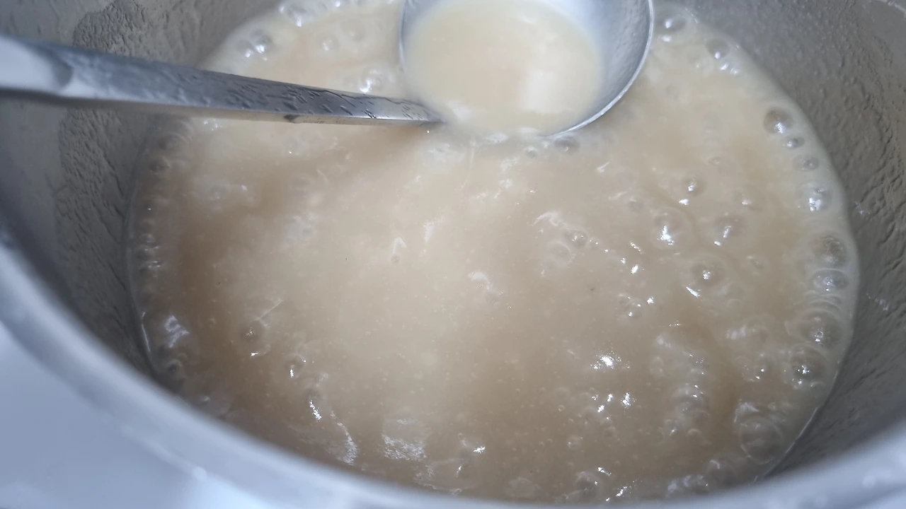 4) 육수 2컵이 되었을 때 육수에 찹쌀가루 3스푼을 넣고 풀죽을 쑨다.