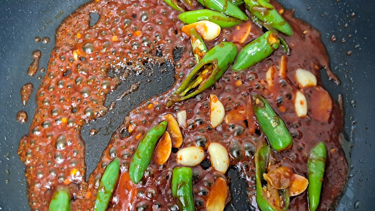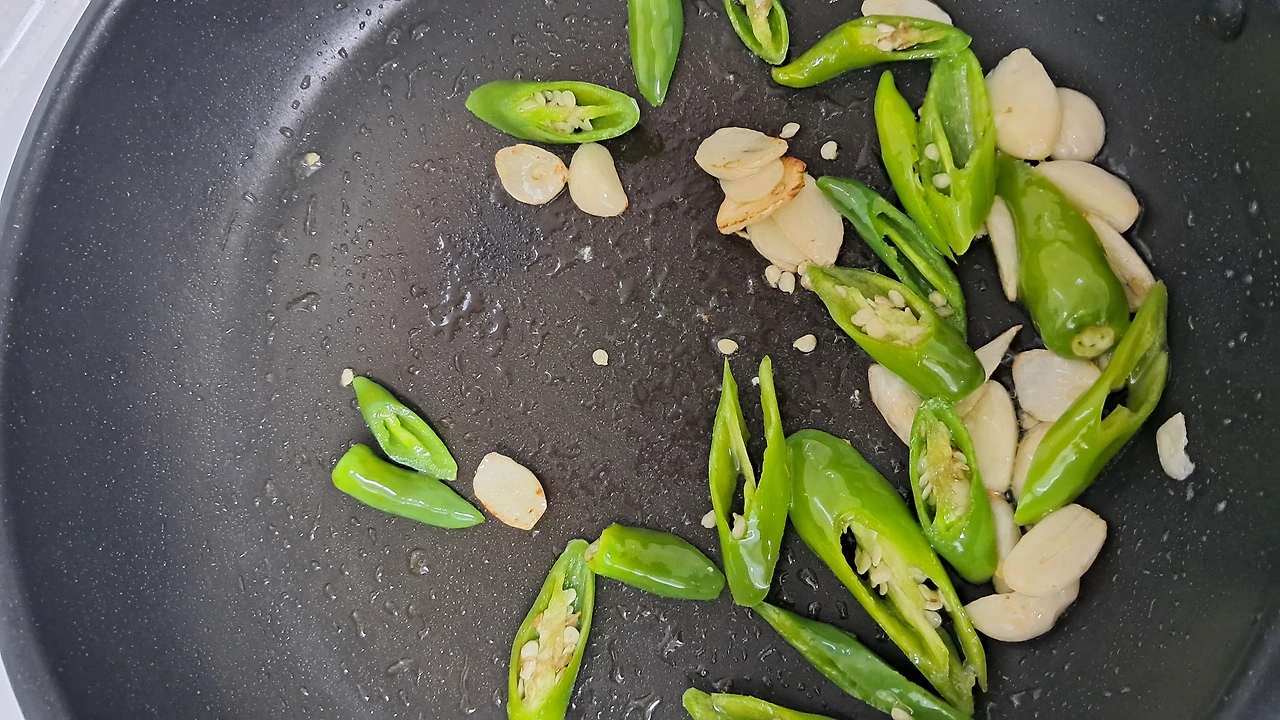 1) 식용유에 대파를 볶아주어 파기름을 낸다. 중간불에서 편마늘을 추가하여 마늘 기름을 내고 고추를 볶는다. 이때 멸치를 함께 넣고 볶는다. 파기름이 스며들게 하기 위함이다.