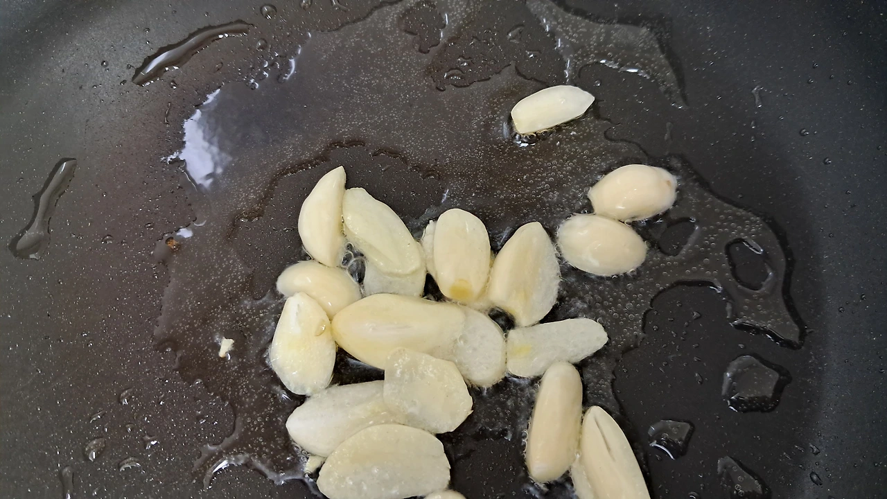2) 기름에 마늘을 볶기 전 대파 흰 부분을 충분히 볶아 촉촉한 파기름을 만들어준다. 그 후 편마늘을 추가로 볶는다.
