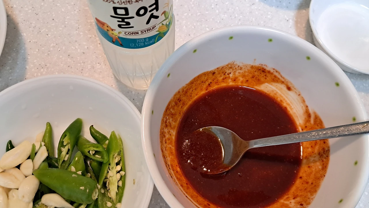 1) 양념장 재료: 고추장 1큰술, 진간장 1큰술, 맛술 2큰술, 액젓 1큰술, 설탕 1큰술, 물엿 2큰술, 고춧가루 2/3큰술, 물 2큰술