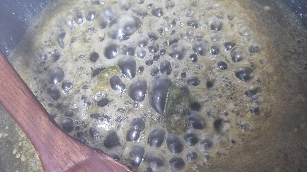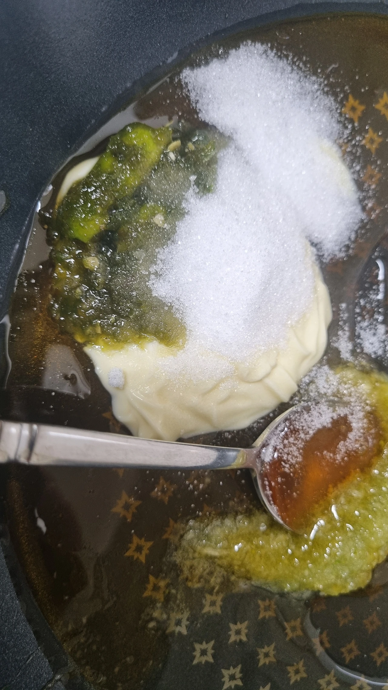 3. 그 프라이팬을 다시 인덕션 위에 올리고 식용유 4스푼, 맛술 3스푼, 다진 마늘 3스푼. 설탕 1스푼, 요리당 3스푼, 마요네즈 3스푼 넣고 살짝 끓어오를 때까지 볶기. 청양고추청을 한수푼 넣어 마저 뒤적여주기