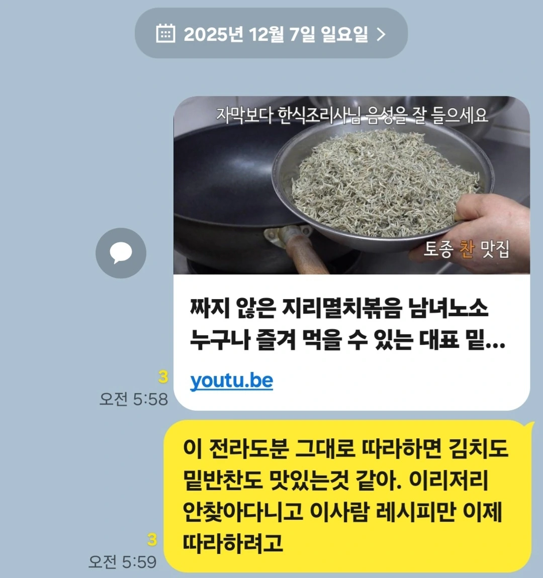 여러 유튜브를 찾아다니지 않겠다는 다짐을 6남매 단톡방에 올렸는데, 대꾸가 없다. 동이 트면 띠동갑 이상인 오빠 언니들한테 새벽에 카톡 울렸다고 혼나겠다. ㅎ 멀리 떨어져 살길 잘했다. 동이 트길 기다리며 멸치볶음 실험을 해보기로 했다.