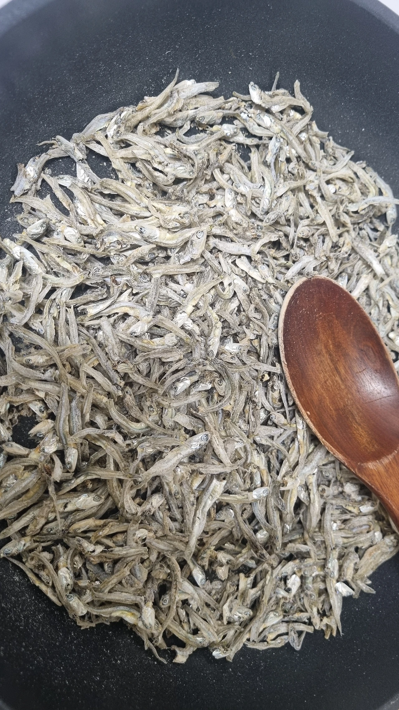 4. 멸치 투하하여 뒤적뒤적 볶기. 불을 끄고 참기름과 통깨 넣고 뒤적뒤적 볶기