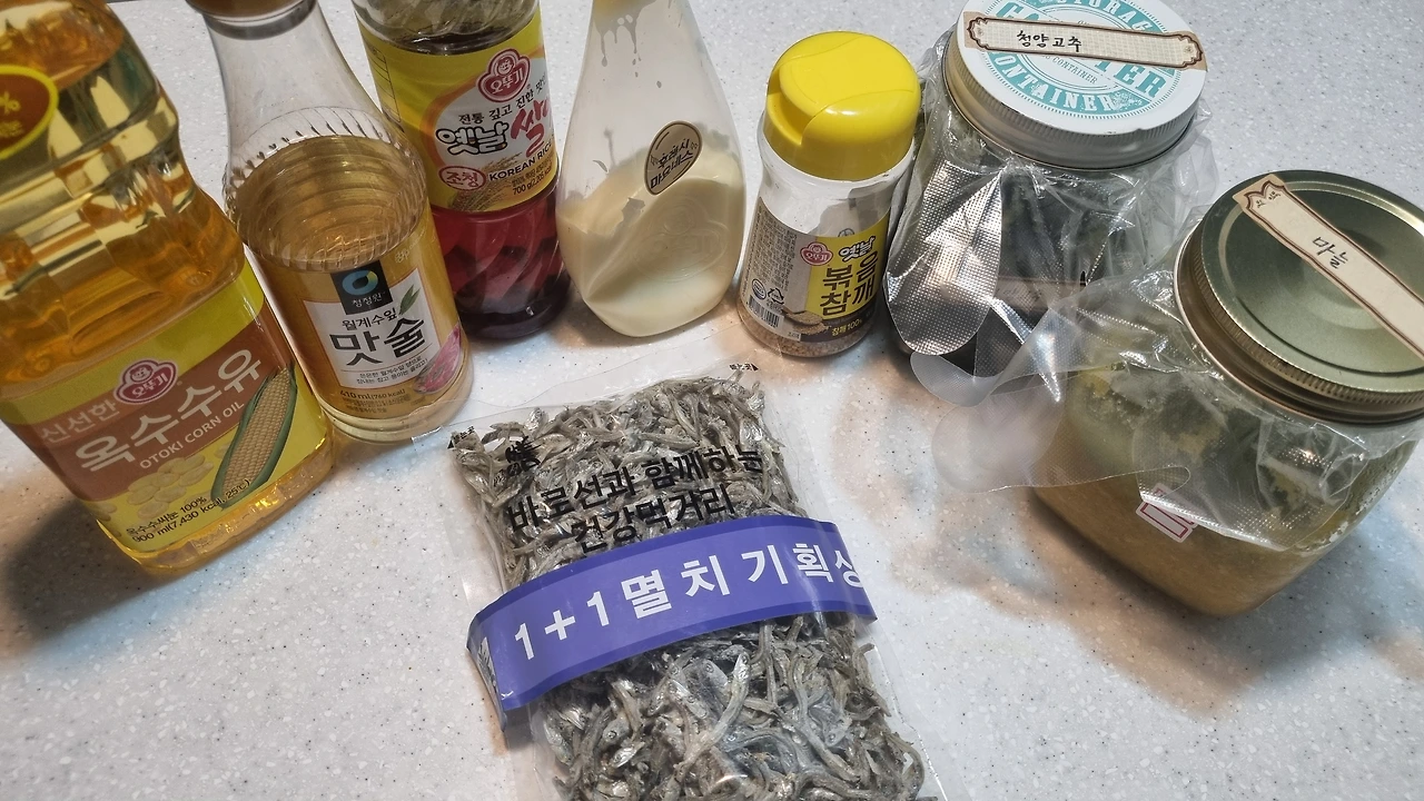 냉장고에 지리멸치 대신 작은 멸치가 있다. 400g은 안될 듯하고 200g 정도인 듯하다. 다진 마늘 대신 마늘청, 청양고추와 붉은 고추 슬라이스 해서 넣으면 좋다는데 만들어둔 청양고추청 한 스푼으로 대체해 본다.