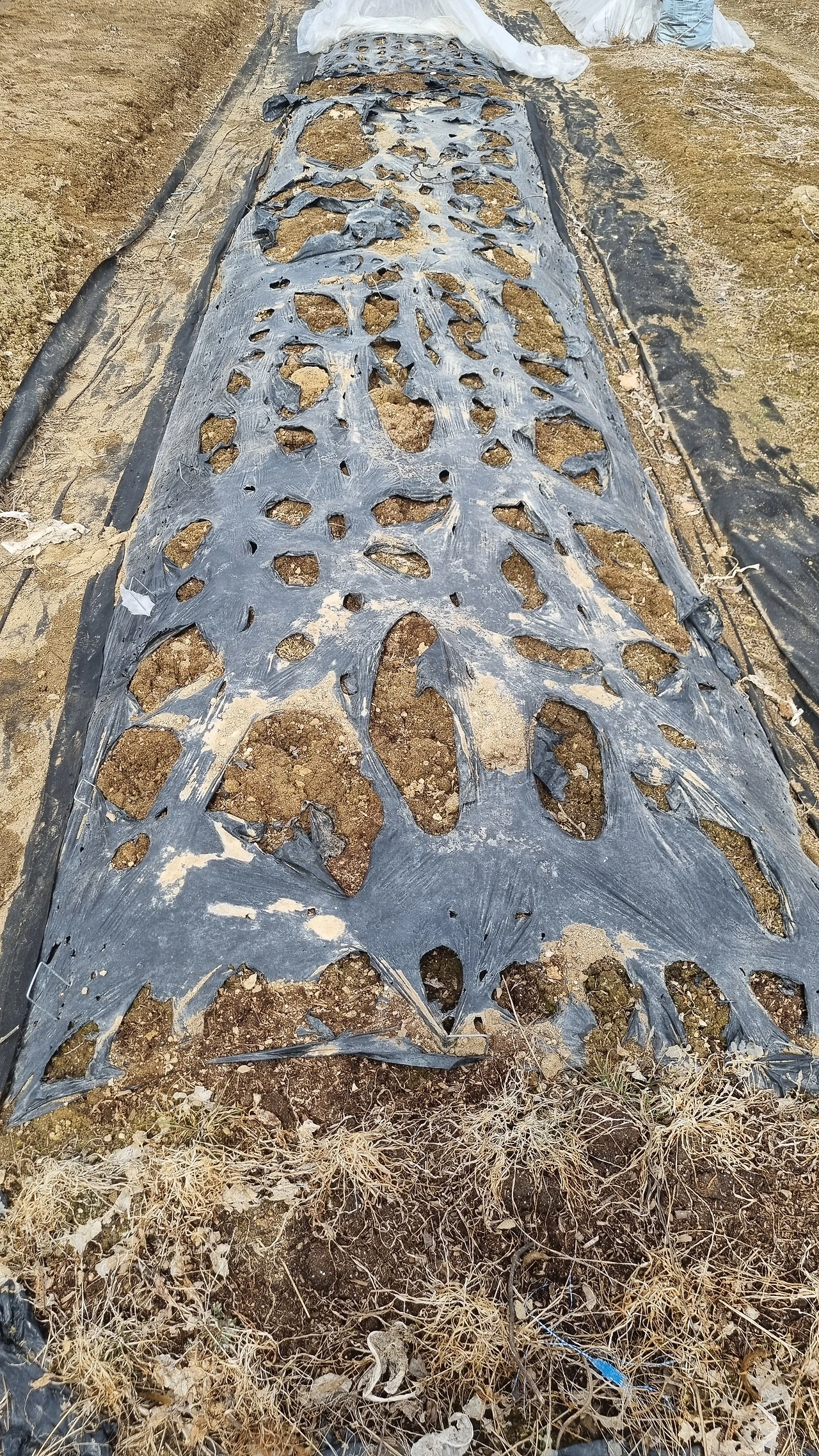 3월 감자농사 시작을 위해 2025년 농사 잔해를 정리하기도 했다. 배추와 무를 뽑았던 자리의 검정 비닐 제거하기, 잡초매트 걷어 탈탈 털고 오이 지지대 위에 말리기, 노끈 등 잔해물 줍기. 모든 쓰레기는 종량제 봉투에 담아 차에 실어왔다.