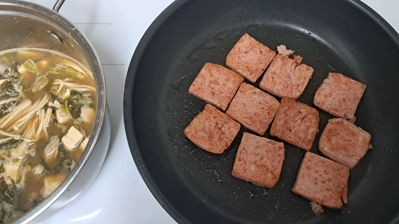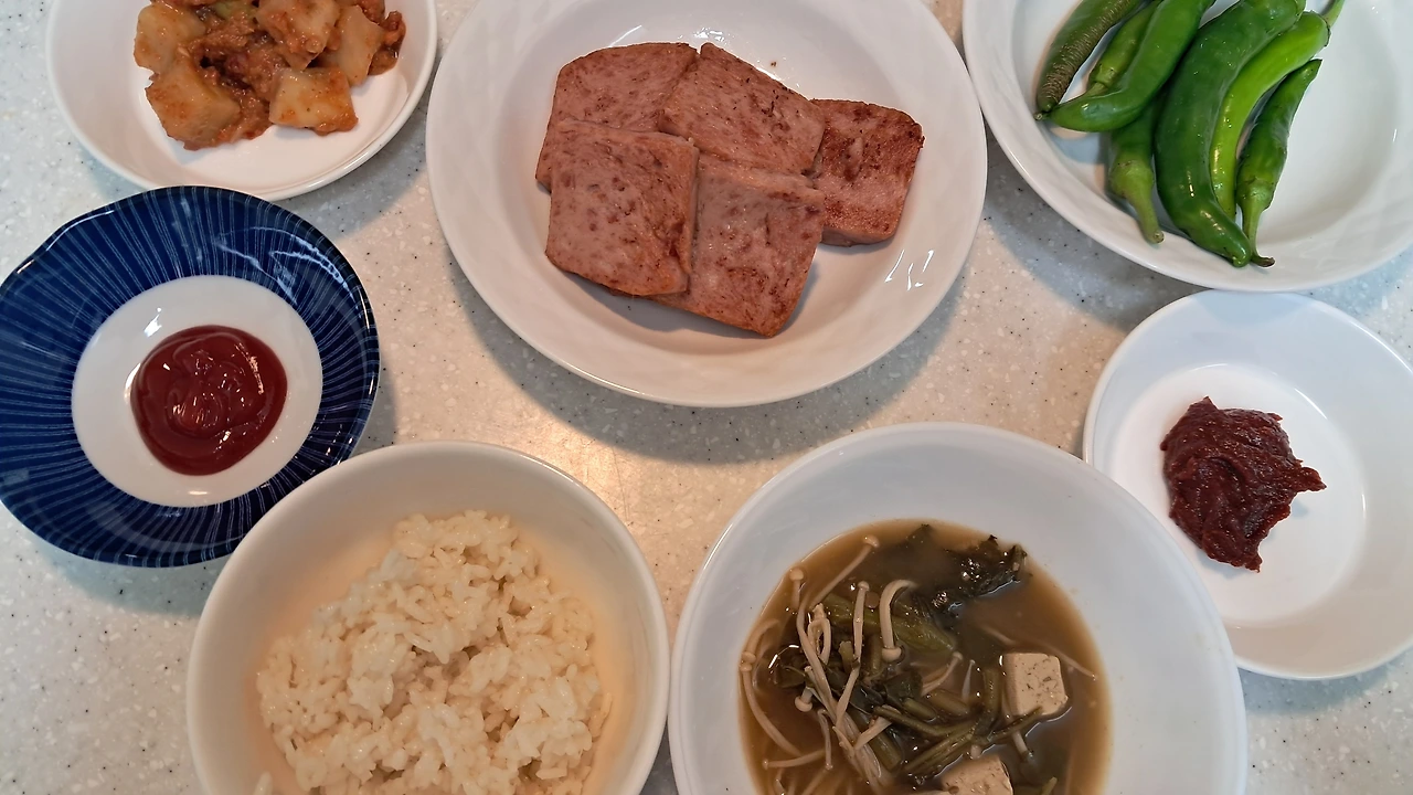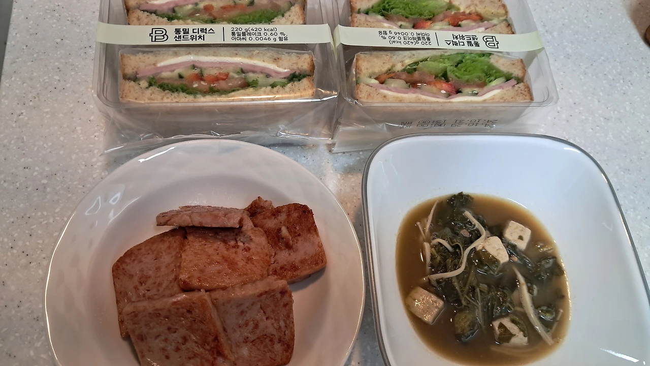 오늘 남편이 출근전 준비해 놓은 아침 메뉴는 아욱 된장국과 스팸구이다. 어제 출장지에서 받은 샌드위치 2개도 놓여있다.