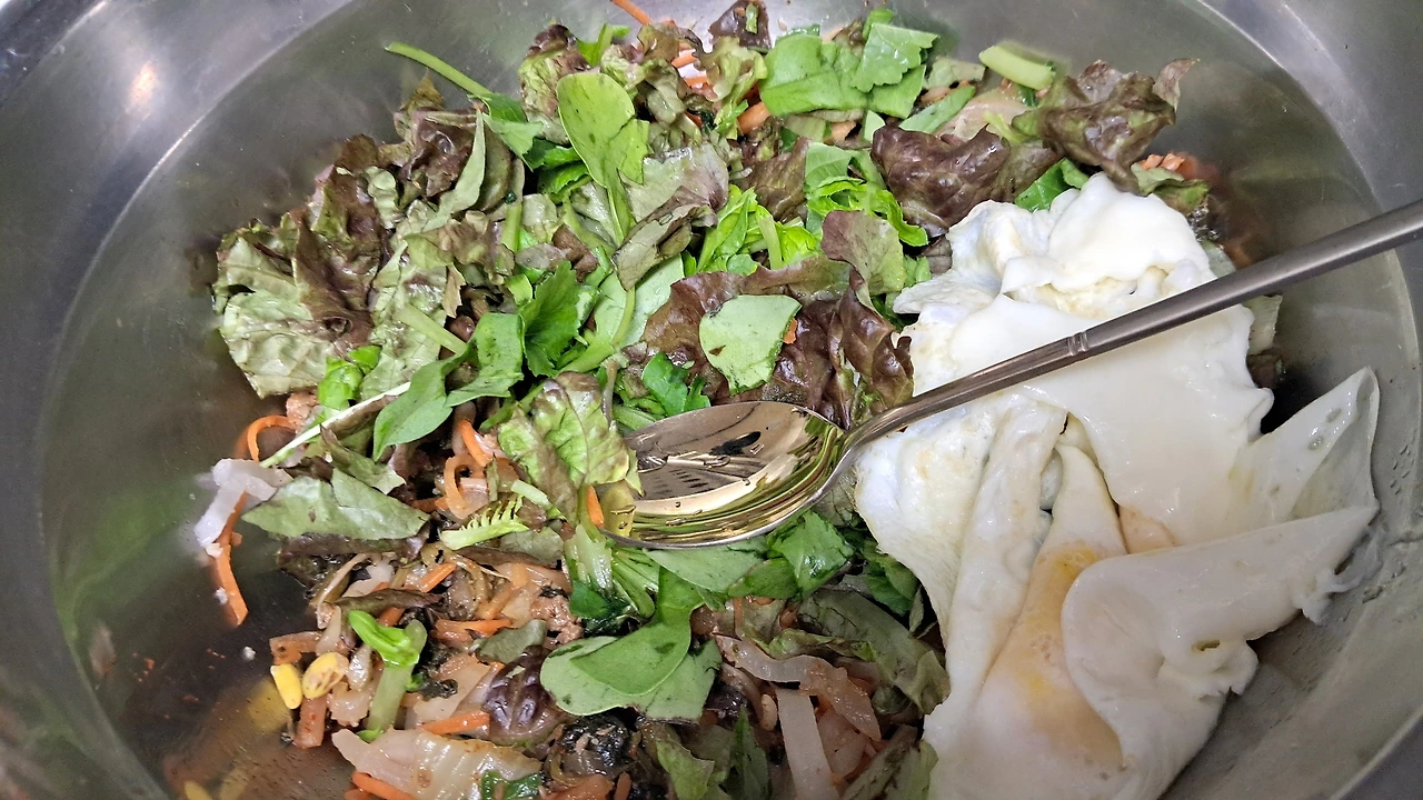 텃밭 루꼴라와 시금치를 포함하여 비빔밥 재료를 섞어놓았다. 아이들이 잠에서 깨면 따뜻한 밥을 추가해 비벼주기만 하란다. 된장국 두 스푼과 간장 한 스푼을 넣으라고 당부한다.