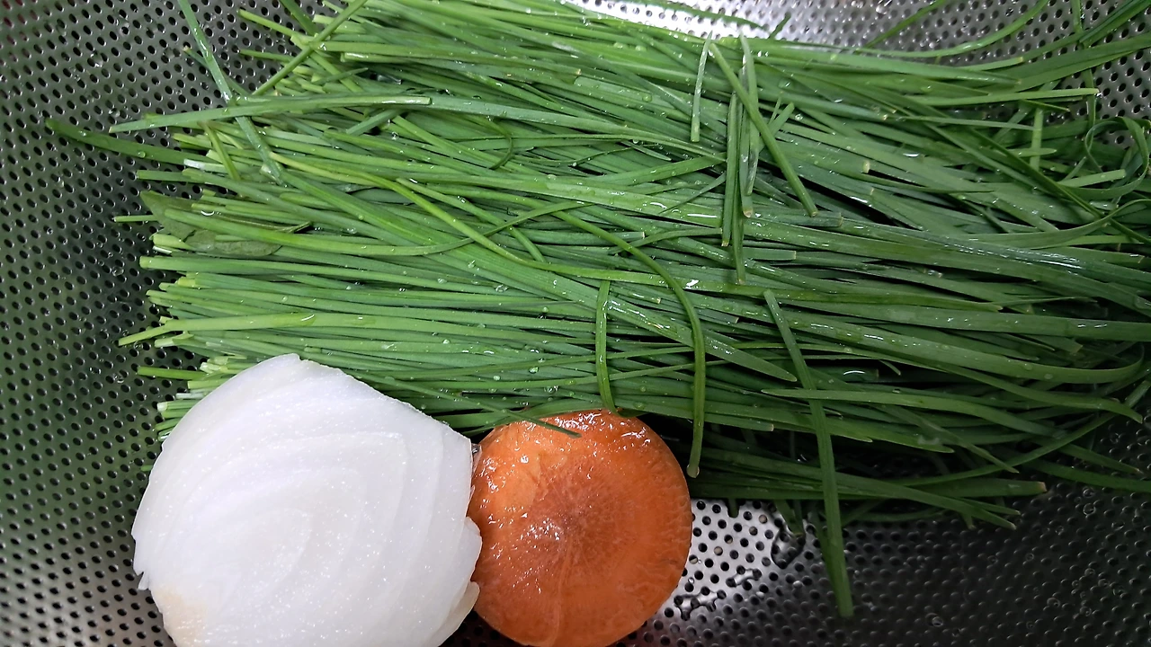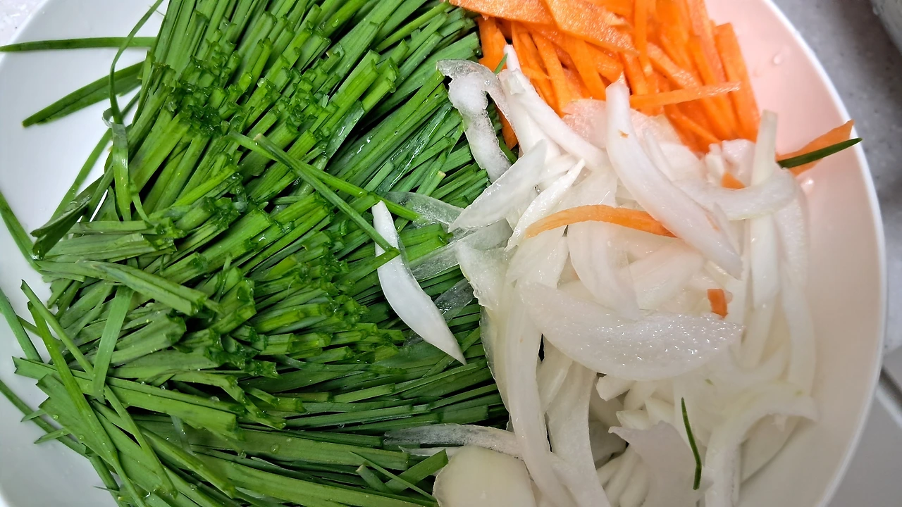부추는 밑동을 바짝 자르지 않았기에 깨끗한 상태여서 흐르는 물에 간단히 헹궈 씻었다. 양파 반 개, 당근 조금은 아주 가늘게 채친다.