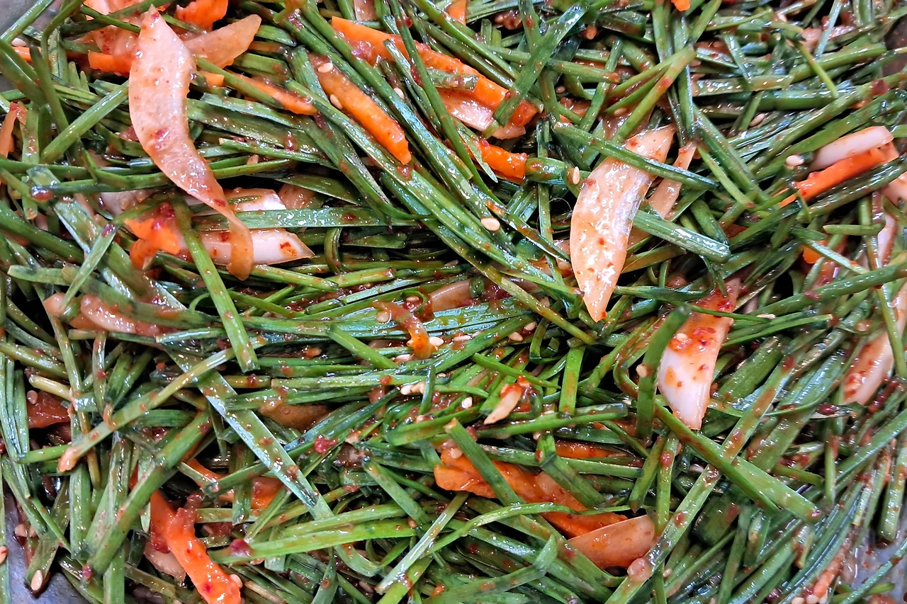 부추 무침을 파절이처럼 훈제오리에 곁들이기.