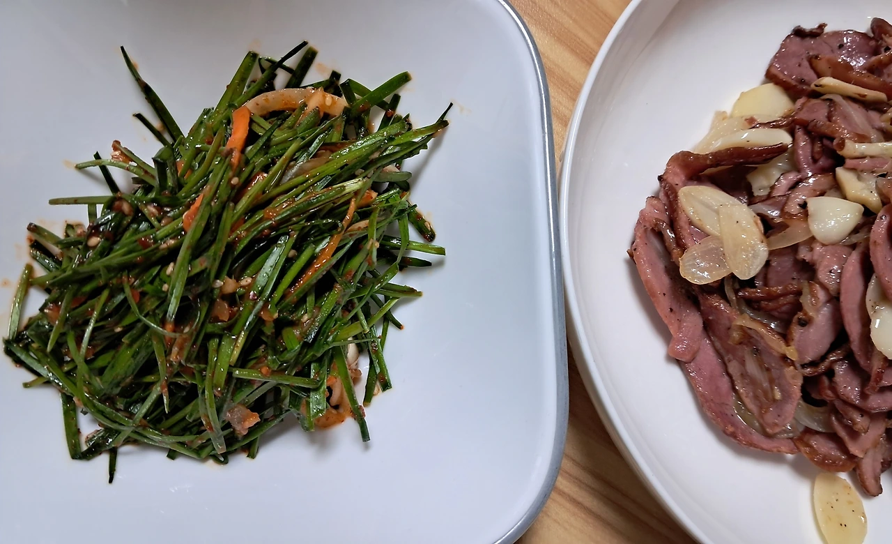 부추무침과 훈제오리구이, 불금 메뉴다.