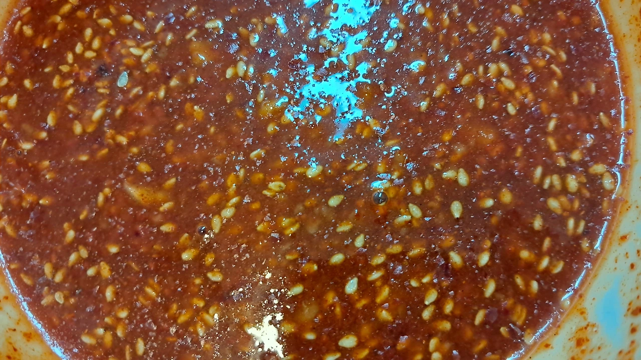 다진 마늘 1스푼, 고춧가루 5스푼, 설탕 1스푼, 물엿 1스푼, 매실진액 2스푼, 멸치액젓 2스푼, 밀가루 한 스푼으로 쓴 묽은 밀가루풀 5스푼, 깨 1스푼을 잘 섞어놓는다.