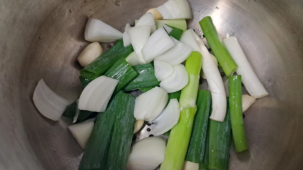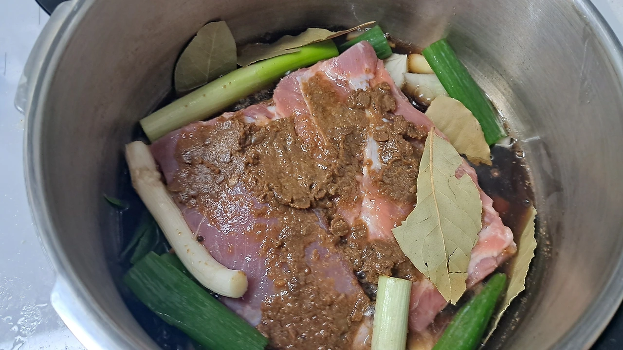 풍년압력솥에 먼저 때려 넣은 건 대파 1대, 통마늘 7개, 양파 1개, 통후추 10알, 월계수 잎 5장이다. 야채 위에 통오겹살을 깔고, 된장을 치덕치덕 발랐다. 마지막으로 물 조금과 콜라 작은 한 병을 쏟아부었다.