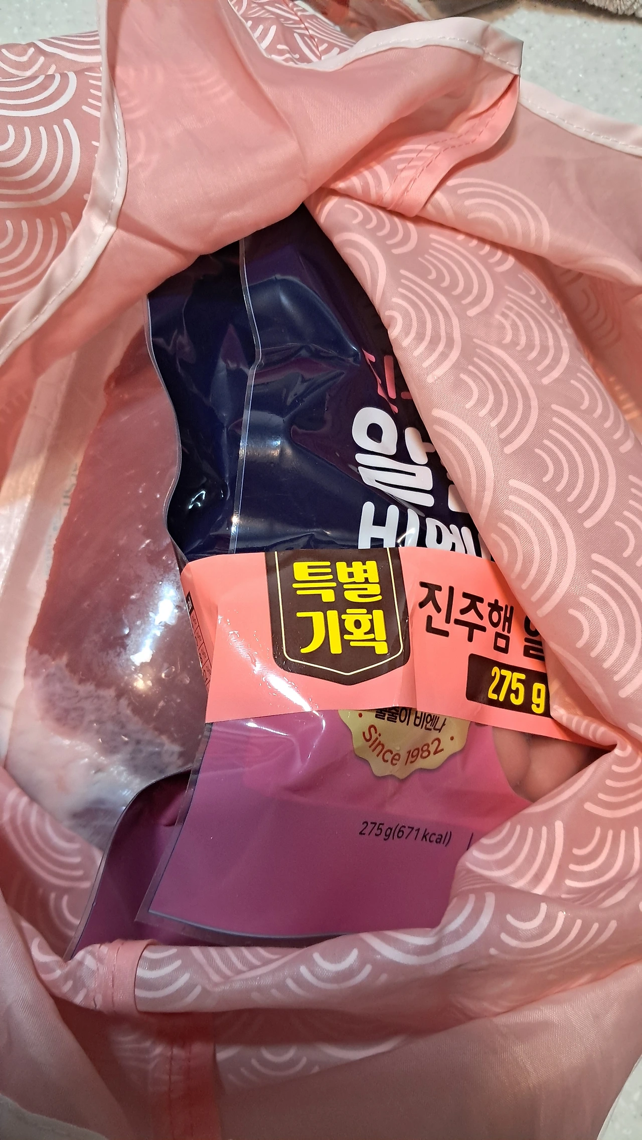 남편이 퇴근하고 장을 봐왔다. 필요한 물건이 있을 때마다 남편이 집 앞 마트에서 장을 본다. 그래서 남편의 가방 속에는 항상 분홍 장바구니가 있다.