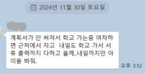 계획서가 안 써져서 직장에 가는 중. 여차하면 근처에서 자고 내일도 직장에 가서 서류 출력까지 다 하고 올게. 내일까지만 아이들 봐줘.