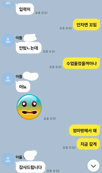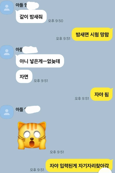 여느 때처럼 스터디카페로 퇴근해서 공부 중이었다. 집에 있던 중학생 아들로부터 SOS 카톡이 왔다. 내일 시험이니 밤을 같이 새달라는 거다.
