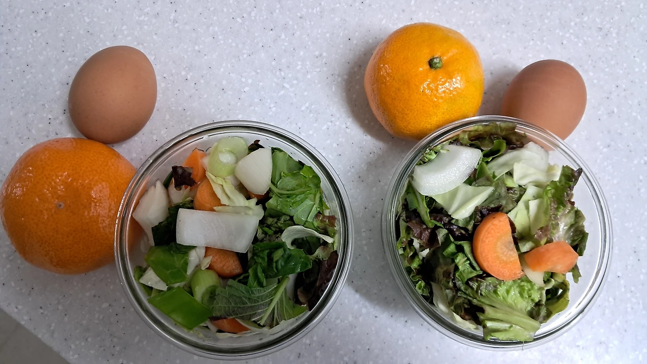 텃밭에서 수확한 루꼴라, 대파, 양배추, 당근을 아무렇게나 썰었다. 마트에서 구입해 둔 깻잎, 상추, 양파도 준비했다. 큰 볼에 야채를 조금씩 덜어 골고루 섞었다. 식초절임 소스에 대충 버무리고 계란 1개, 귤 1개를 쌌다.