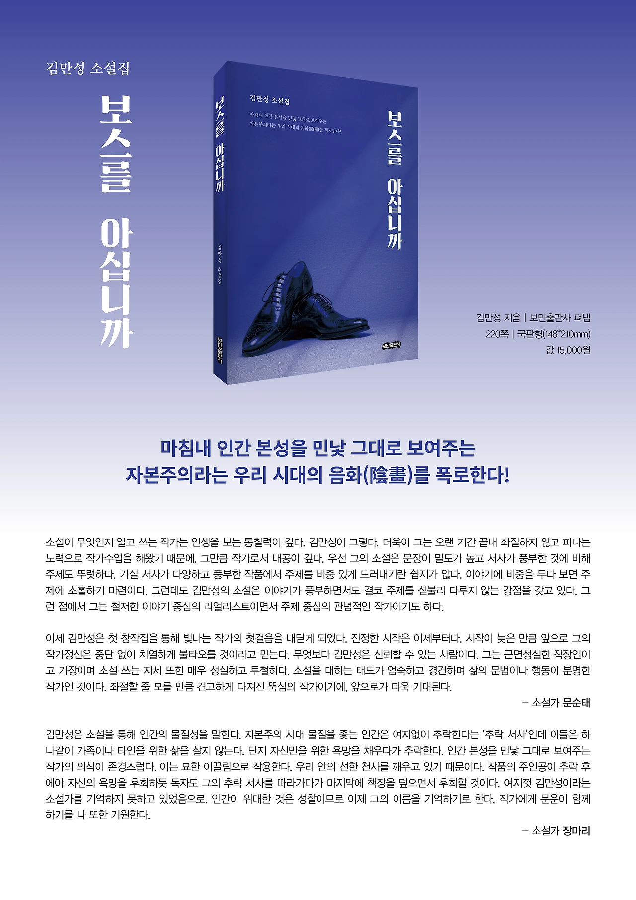소설집에 표제작인 [보스를 아십니까] 외 6편을 실었다. 신춘문예에 당선되기 전까지 30년 세월의 통찰과 경험을 녹인 작품이지만 막상 세상에 나아가 독자들을 만난다고 하니 걱정 반 설렘 반의 마음이다.