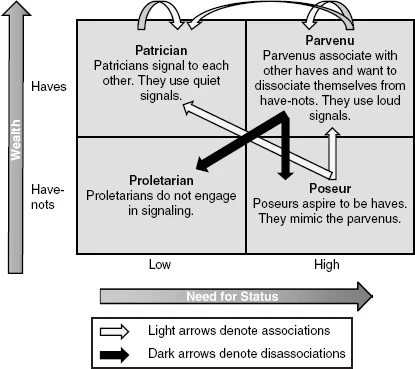 위의 시그널 매트릭스를 보면 귀족(Patrician)과 신흥부자(Parvenu)의 결정적 차이는 바로 "누구에게 잘 보이려고 하는가?"입니다. 귀족들은 일반인, 신흥부자들에게 잘 보일 필요가 없습니다. 그래서 주문 제작, 덜 알려진 브랜드, 빈티지를 추구하고 서로만 아는 시그널을 보냅니다. 반대로 신흥부자들은 일반 대중에게 잘 보이는 것이 주목적이므로, 누구나 다 아는 시그널을 사용합니다. 멀리서 이것을 보는 귀족들은 신흥부자를 구분해 낼 수 있게 됩니다.