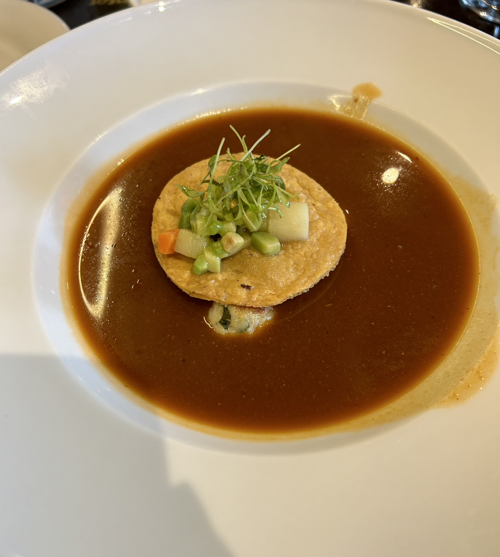 멕시코 전통 닭개장인 틀랄판 수프(Caldo Tlalpeño)를 시켰습니다. 살짝 매콤한 국물을 따로 들고 와서 접시에 부어 줍니다. 원래 닭고기를 찢어서 넣는데 동그란 닭완자로 재해석한 것이 재미있습니다.