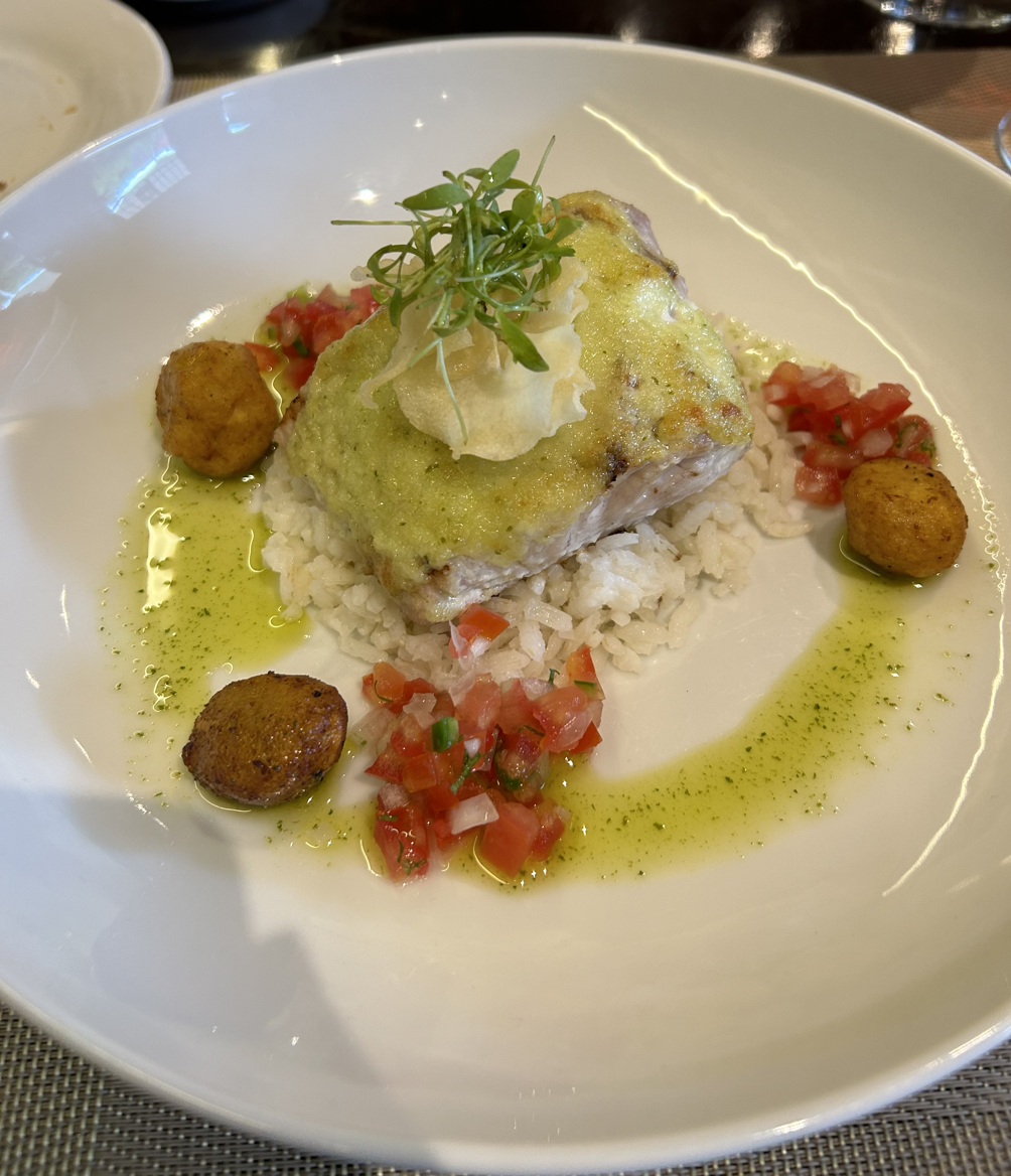 생선구이(Pescado a la talla)가 밥과 플렌테인과 같이 나왔습니다. 약간 비즈니스 클래스 기내식을 연상시키는 비주얼이었는데 매우 맛있었고 특히 톡 쏘는 신맛 칠리소스와 궁합이 좋았습니다. 칠레 엔 노가다도 그렇고 멕시코 사람들은 빨강-하양-초록 국기 색깔을 음식에 넣는 걸 좋아합니다.