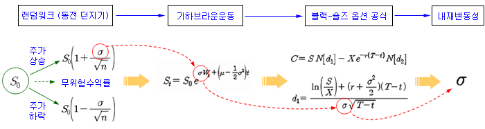 3. 1973년 경제학자들은 브라운 운동과 랜덤워크 가설을 이용하여, 주식의 수익률이 정규분포를 따른다고 가정할 때, 주식이 어느 시점에 어느 가격이 된다는 확률을 도출해 내고 그에 따른 옵션 가격의 기댓값을 구하는 공식을 만들어 냈습니다. 이것이 노벨상 수상에 빛나는 블랙-숄즈 옵션가격공식(Black-Scholes Model)입니다.