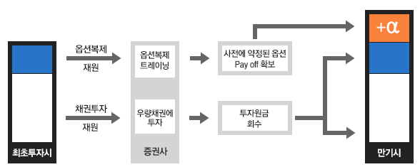 5. 우선 ELS를 판매하고 투자자에게 받은 돈의 70%는 안전하게 채권투자로 돌리고, 나머지 30%를 이용해서 옵션과 실물 조합을 구성합니다. ELS의 조건을 보면 녹인(knock-in), 배리어(barrier) 같은 여러 조건이 붙어 있는데 이것은 일반적으로 시중에 판매되는 옵션만 가지고는 불가능하고, "지수가 -30% 이하 떨어졌을 시 옵션 발동" 같은 조건이 붙은 이색 옵션(exotic option)을 이용해야 합니다. 그러니까 파생상품 중에서도 상당히 복잡한 축에 속하는 것입니다.