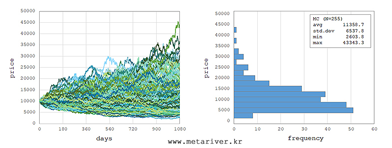 4. 이제 옵션 가격은 알았지만 ELS는 통상 두 개 이상의 옵션을 조합해서 만듭니다. 그러면 어떻게 계산하느냐? 각 기초자산의 시간과 공간을 3D 격자로 만들어서 유한차분법(Finite Difference Method)을 사용하거나, 고성능의 GPU를 동원해서 확률미분방정식을 수백 번 계산하는 몬테카를로(Monte Carlo) 시뮬레이션을 돌리면 됩니다. 참 쉽죠?