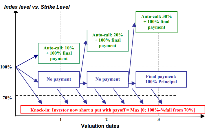6. 많이 판매되는 유형인 녹인 스텝다운(step-down) 형태를 봅시다. 참고로 이 상품을 외국에서는 ELS가 아니라 Autocallable Structured Products라고 부릅니다. 즉 "정기적으로 조건을 만족하면 자동으로 콜 옵션이 행사되면서 쿠폰이 지급되고, 만약 녹인 밑으로 떨어질 시 자동으로 풋 옵션의 매도가 발생"하는 구조입니다. 이렇게 "조건 만족 시 자동 발동"하는 풋 옵션을 DIP(Down-and-In Put)이라고 부릅니다.