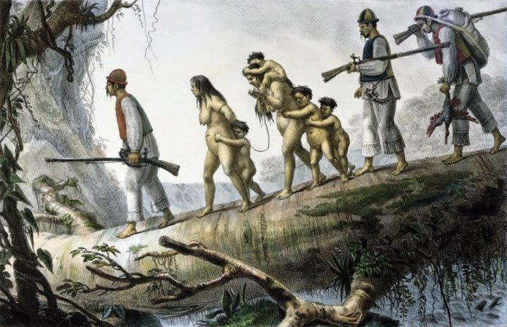 시대를 거슬러 올라가 1494년, 스페인과 포르투갈은 라틴아메리카 식민지를 나눠 가지는 토르데시야스 조약을 체결했습니다. 하지만 뚜렷한 국경이 없는 상황에서 조약은 제대로 지켜지지 않았고 경계선이 스페인에 절대적으로 유리했기 때문에, 지금의 우루과이, 히우그란지 두 술 지방에서는 영토분쟁이 끊이지 않았습니다. 이런 무법지대를 적극적으로 이용했던 집단이 바로 포르투갈 용병 반데이란치스(Bandeirantes)들이었는데요, 군대라기보다는 사립 용병에 가까웠던 이 포르투갈인들은 토르데시야스 조약을 무시하고 정글 깊숙이 들어가 원주민들을 잡아 노예로 파는 일을 했습니다.