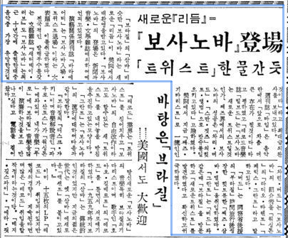 예전에 인터넷을 뒤적이다 찾은 무척 오래된 한국 신문에서의 보사노바 언급입니다. 정확한 날짜는 알 수 없으나, "스탄 겟츠" 와 "차린 버드" 가 히트한 "째즈 쌈바" 의 언급으로 보아 1962년 즈음으로 보입니다. 아직 1964년 이파네마의 소녀를 히트시킨 Getz/Gilberto 앨범은 나오지 않은 것 같습니다. 레코드사가 트위스트를 집어치우고 보사노바를 내어놓고 있다고 합니다...