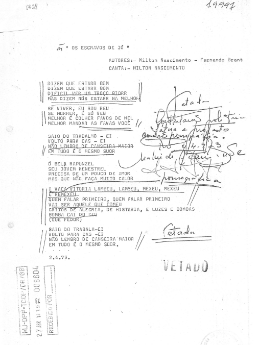 한 예로 "욥의 노예들" 이라는 제목의 이 노래는 가사가 모두 검열되었습니다. 당시 검열관이 쓴 노트를 보면 "다들 나아질 거라고들 말하네, 이보다 더 나빠질 수는 없으니까" 같은 부분(첫 단락)이 심기를 건드린 것을 볼 수 있습니다. 밀통은 대신 흑인 노예들의 전통 리듬이었던 Jongo와 카포에라 악기인 베링바우를 가지고, 독재에 대한 저항을 노예들의 투쟁으로 돌려서 표현했습니다.