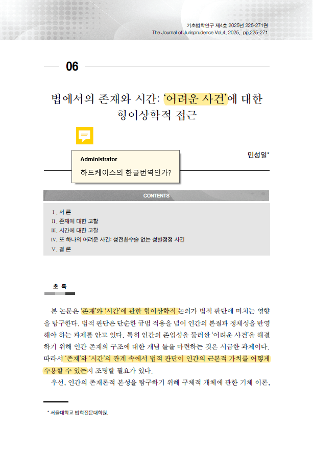 민성일, 《법에서의 존재와 시간: '어려운 사건'에 대한 형이상학적 접근》, 서울대학교 법학연구소 법이론연구센터, 『기초법학연구』 제4호, 2025. 5., 225-271면