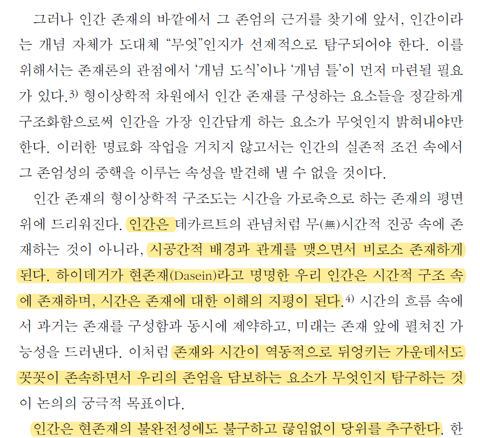 인간 존재의 바깥에서 존엄의 근거를 찾기에 앞서, 인간이라는 개념 자체가 도대체 무엇인지가 선제적으로 탐구되어야 한다. 이를 위해서는 존재론의 관점에서 명확한 개념틀이 마련될 필요가 있다.