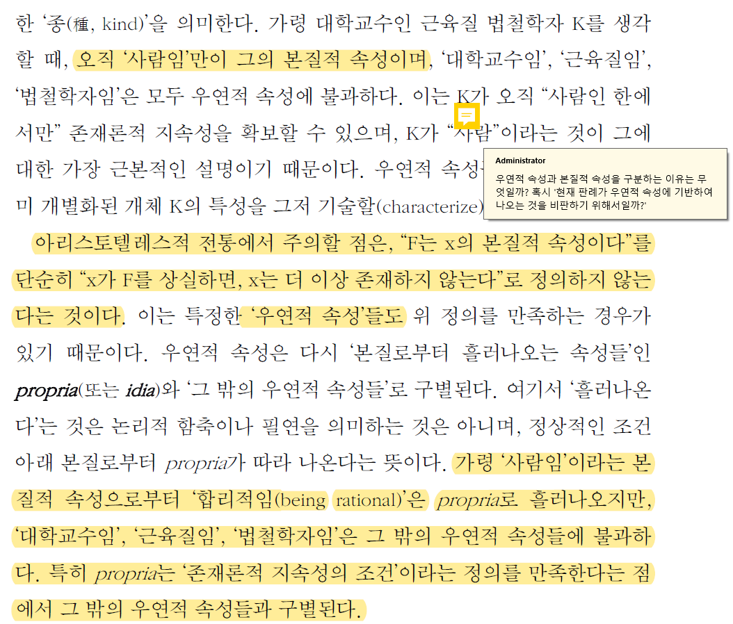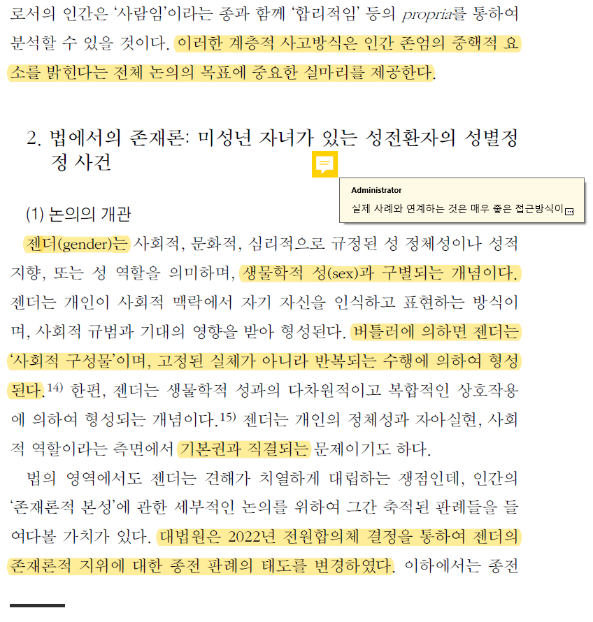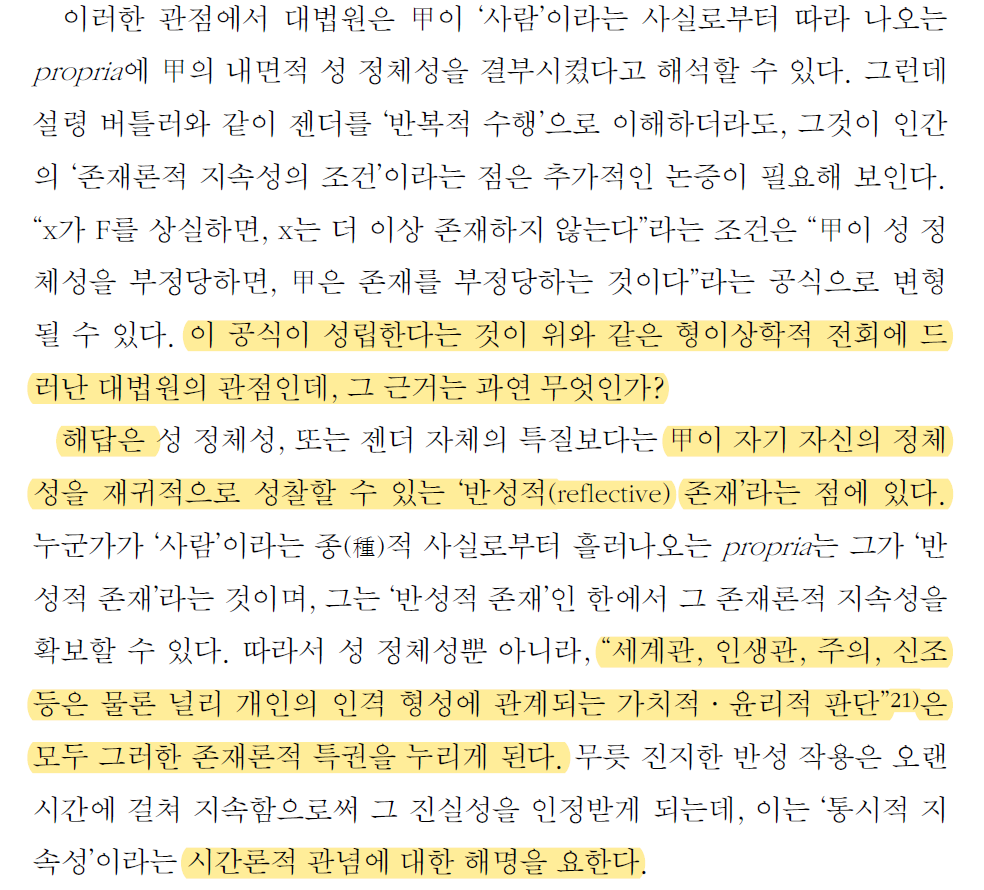 대법원은 '인간임'이라는 본질적 속성으로부터 반성적 존재(reflective being)라는 고유속성(propria)이 필연적으로 도출된다고 보았다. 인간은 자신의 삶과 정체성을 재귀적으로 성찰하고 구성해 나가는 존재이며, 이러한 성찰의 결과물인 '성 정체성'은 단순한 취향(우연적 속성)이 아니라, 그가 그 사람으로서 존재하기 위해 필수적인 본질적 요소가 된다.