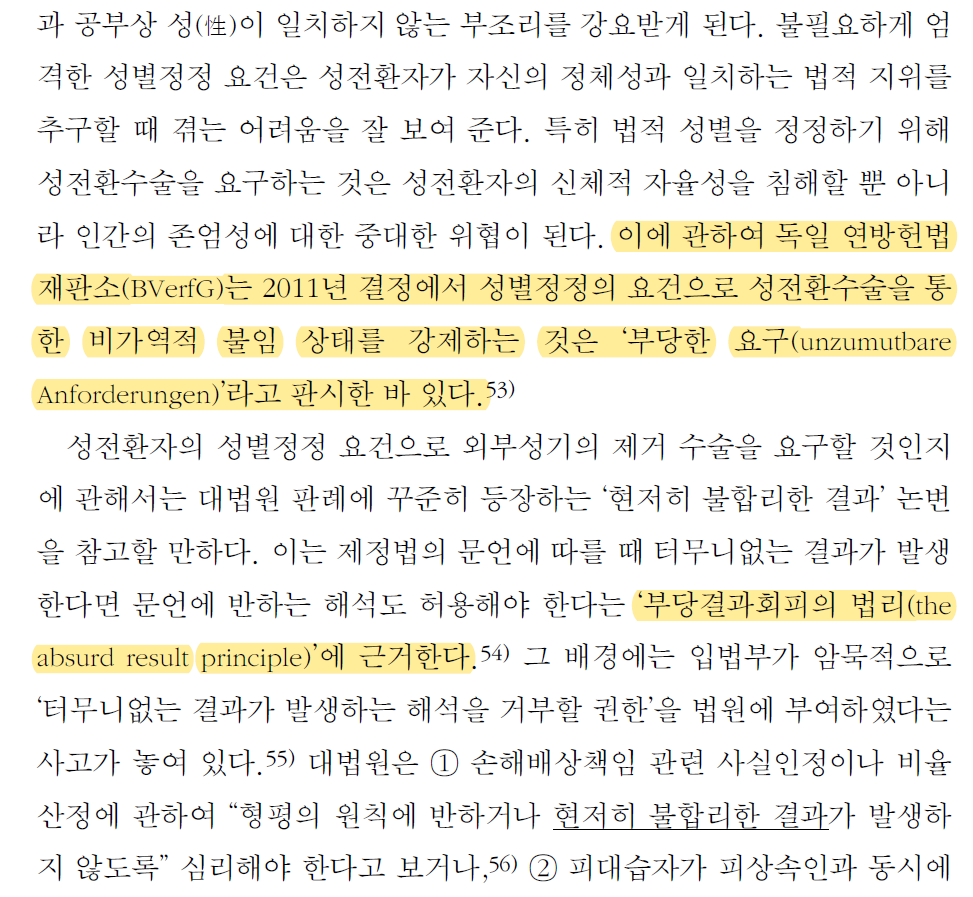 성별정정을 위해 원치 않는, 혹은 건강상의 이유로 불가능한 외과적 수술을 강제하는 것은 '현저히 불합리한 결과'를 초래한다. 독일 연방헌법재판소(BVerfG)는 2011년, 성별정정을 위해 영구 불임 수술을 요구하는 것은 신체적 온전성을 침해하는 부당한 요구(unzumutbare Anforderungen)라며 위헌 결정을 내렸다.